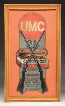 ADVERTISEMENT. Topped by the red circular UMC trademark. Pictures a red & green box of UMC 22 cal. cartridges behind a crossed pair of Remington Model 12 pump rifles against a gray background. Lower portion of advertisement is marked “THE NEW / REMINGTON / .22 RIFLE / SOLID BREECH HAMMERLESS REPEATING” over “TAKES 22 SHORT, LONG AND LONG RIFLE CARTRIDGES.”. Consignor information dates the advertisement to 1910. HEIGHT: