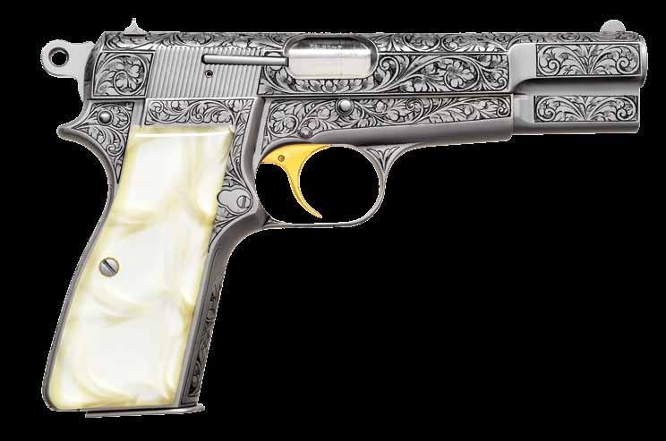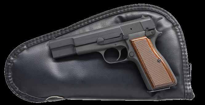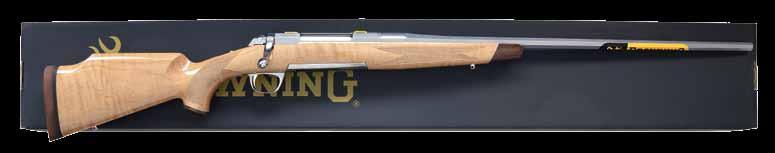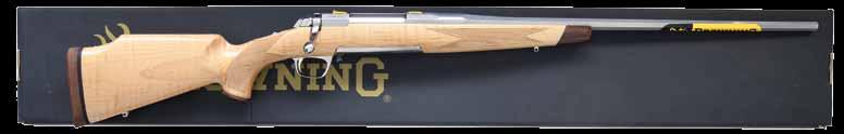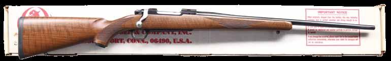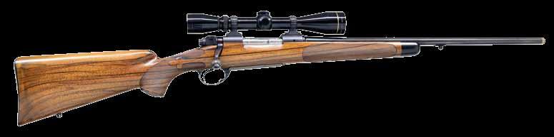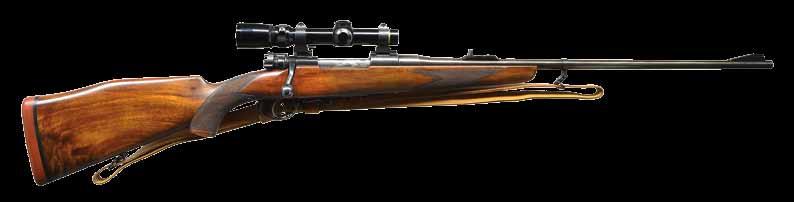 rear. FN type model 98 Mauser action has maker’s name and address on solid sidewall and FN logo on receiver ring. Bolt, with typical FN handle, is polished bright and original scope safety is in place in early style shroud. Bottom metal has removable floorplate with pin type release. Capped pistol grip buttstock of handsomely figured and nicely streaked European walnut measures 13-3/4” over FN marked ribbed horn buttplate. Stock features swept right hand cheekpiece, hard rubber grip cap and stock bolt. Hand cut point pattern checkering wraps around forend and has beaded border at bottom of grip. Rifle is fitted with a leather sling. A Leupold Vari-X II 2X7 scope with duplex reticle is in Buehler rings and mounts. CONDITION: very fine. Metal retaining over 95% original blue. Temper blue remains very strong on bolt release and trigger. Stock finish is also very fine with only a few light marks in original finish. Checkering is slightly darkened. Bore is bright and shiny. Scope is good; optically clear. (23-4647/MGM). CURIO. $1,200-1,800.