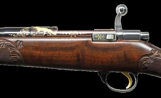 of proofs, caliber and distributor (Gun South Inc. of Trussville, AL). Mfg. March 1989 (1980-1996) with coin finished receiver, butterknife bolt handle, magazine base and floorplate having scroll engraving plus deep relief Roe deer scene on left rear of receiver (1 buck & 2 does). Company promoted features of 7.7 pounds, sub MOA performance and 1 in 8.6 inches barrel twist rate. Consignor states this ornate rifle was part of the Prince Faisal Collection; no further info as to which one or which country of reign. Finely checkered (2 line borders) full length (Stutzen) left handed European walnut stock with matte finish having Bavarian style double flame cheekpiece, sling studs, factory brown ventilated recoil pad, LH palm swell (Bundsweir pistol grip), wrap around forend checkering, slant cut forend cap and rosewood grip cap having Steyr logo inlay. Receiver is factory drilled and tapped for scope mounts w/ plug screws in place. Safety is rotating wheel in line behind bolt shroud that has integral cocking indicator. Very fine single stage gold plated trigger pull that also operates in single set mode for an even lighter pull; LOP is Steyr standard at 13 7/8”. Smooth operating bolt having rear locking lugs is jeweled with Sako style extractor. Trigger guard assembly has spring plunger magazine ejector feature and indexed screws. MAGS: 1 steel single column 3 round w/ continuation of action engraving to include vignette of buck head and shoulders. CONDITION: all aspects near excellent including bore; new unfired appearance. (23-446/NW). MODERN. $6,500-8,500.