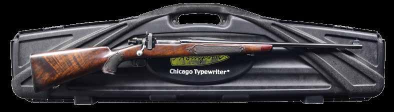 model 70 action. Features include custom bottom metal w/ release in trigger guard bow, checkered bolt release, & 3 panel checkering on bolt handle. Bolt body, extractor, feed rail & follower have fine machine jeweling. Muzzle has double gold bands & additional inlaid gold wire highlights found on floorplate, bolt knob, scope rings along w/ skeleton steel grip cap & buttplate. Classic style cheekpiece sporter stock of fancy thinshell walnut having vivid dark streaking. Wrist of stock & forearm have wraparound fleur-de-lis borderless hand checkering. Additional checkering is found within the skeleton steel buttplate & grip cap. Additional stock features include contrasting black forearm tip & inletted rear swivel base, front swivel base is bbl. mounted. This beautiful rifle is complimented by a Leopold Century Limited Edition 3-9 x40 gloss finished scope w/ duplex reticle. CONDITION: near excellent as customized. Stock shows a few very