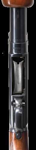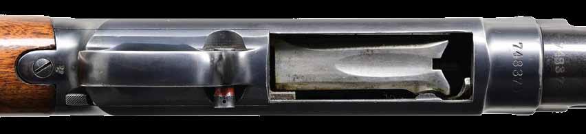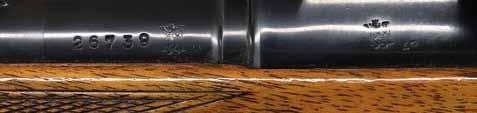 grip buttstock measures 14” over steel buttplate and features swept right hand cheekpiece, checkered grip, raised side panels, recoil bolt through stock, schnabled forend tip and transverse barrel bolt through oval steel escutcheons. Sling loops are fitted. CONDITION: fine. Metal retaining about 40% original finish. Stock with most of its original oil finish has many scratches and marks. Bore is bright and shiny. Action is smooth. Mechanically good. (01-24660/MGM). ANTIQUE. $1,500-2,500.