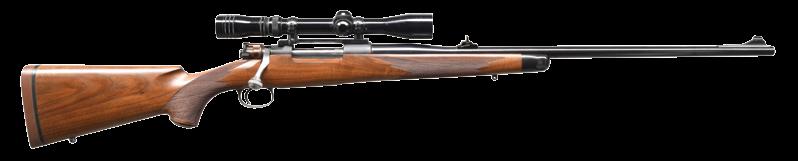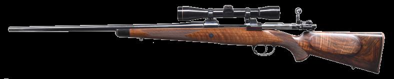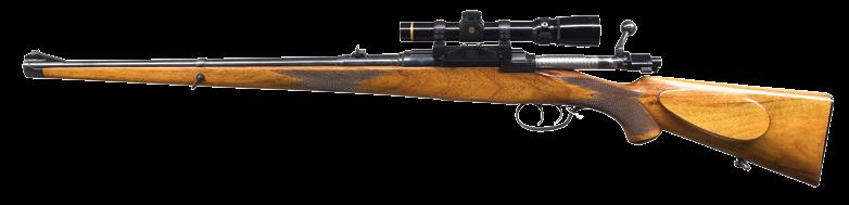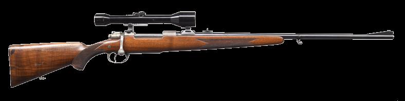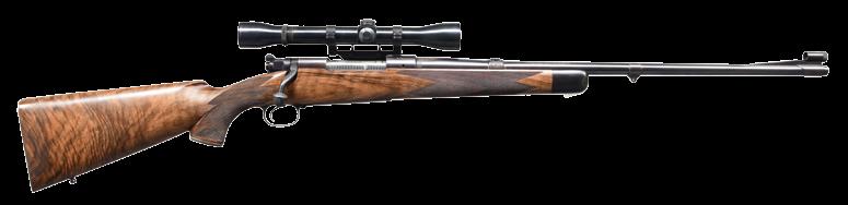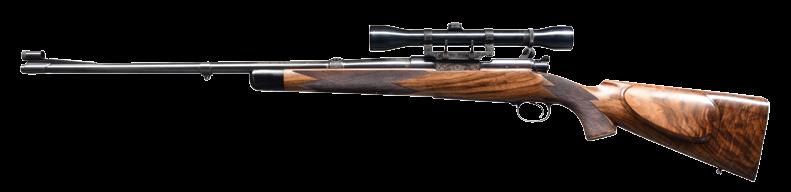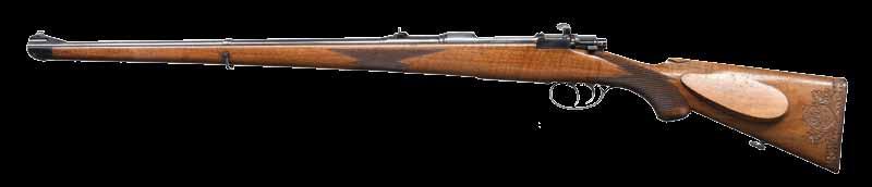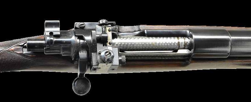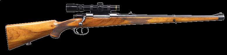 8.51mm. S# 72738. Bbl. 21 1/2” tapered w/ stepped breech. Bead front sight is mounted on a checkered ramp. Island mounted express rear sight w/ 1 standing & 2 folding leafs. Action has bases for claw mount scope attachment. Model 98 action w/ claw extractor, turned down bolt handle & 3 position safety. Double set triggers. Hinged floorplate w/ lever closure. Full length mannlicher straight comb cheekpiece stock of fancy European walnut having a tight fiddle grain. Features include point pattern hand checkering, hard rubber grip cap & sling swivels.
