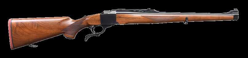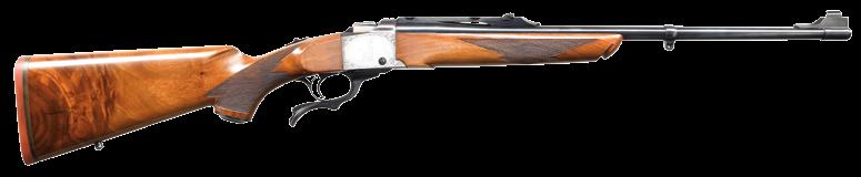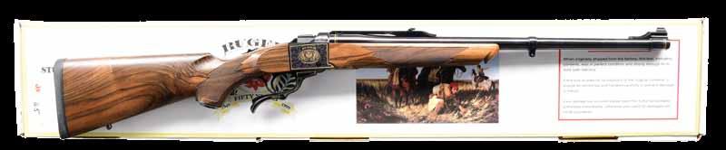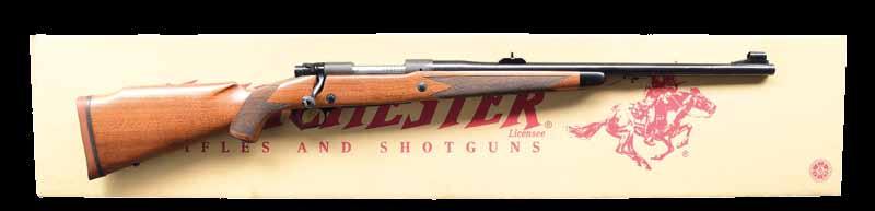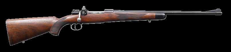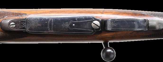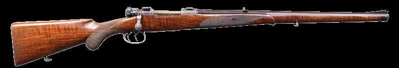 2004. JOHN RIGBY SQUARE BRIDGE MAGNUM MAUSER ACTION RIFLE. Cal. 375 H&H. S# 4093 (Mauser action # 52564). Originally built as a 350 Rigby, this fine rifle has been expertly converted to a 375, as were most 350s. It has a 24” classically styled tapered rnd. bbl. with raised boss over chamber. Bbl. is fitted with a sleeved-on rear sight base holding a 1-standing, 2-folding leaf express sight with platinum lines and a sleevedon sling eye. Short ramp front sight base is also flush sleeved and holds a silver bead front sight with protector. Top of bbl. is engraved “John Rigby & Co. 43’ Sackville St. London. W.”. Cal. is engraved on the left rear, and original London nitro proofs for 350 EX are stamped on the bottom (wood removed). Classic magnum-length action with raised square bridge is engraved “.375 Magnum” and “RIGBY-MAUSER” on the receiver ring, which is also stamped with London view proof. Rigby serial number “4093” is stamped on the left side below the wood. Mauser serial number is behind the recoil lug. Bolt with an unaltered handle has two checkered panels on a pear-shaped knob. Flag safety is gold-inlaid “(SAFE)”. Original single-stage trigger is retained. Drop box bottom metal has a hinged floorplate retained by the button in the bow, and the Rigby serial number is deeply stamped on the bottom of the bow. Original stock with serial number in bbl. channel is of lightly figured European walnut and measures 13 3/4” over silver-type pad. Stock also features a steel trap gripcap, recoil bolt, sling eye on the toeline, and point pattern checkering at the grip & forend with mullered borders. WEIGHT: 8 lb., 3 oz. CONDITION: very fine, as professionally refinished. Metal parts retaining approx. 90% sympathetic rust reblue, new cal. reengraved. Stock retains most of an old oil refinish with some light scratches and a checkering re-run. Remnants of Kenyan registry numbers are on the toeline behind gripcap. Pad is relatively new. Bore is very fine with some light frosting. Mechanically smooth. An updated all-time classic. (22-2221/ MGM). CURIO. $7,500-12,500.