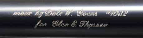 2044. DALE GOENS CUSTOM WINCHESTER MODEL 70 BOLT ACTION RIFLE. Cal. 25-06. S# 542503. Bbl. 23 3/4”. Model 70 bolt action rifle originally mfg. by Winchester in 1961 and subsequently customized by the late gunsmith, Dale Goens. The top of the replacement bbl. is engraved “made by Dale W. Goens #1032/ for Glen E. Thyssen”, with “25 06” marked on the left at the breech. Left side fo receiver is marked with the Winchester trademark logo, with the S# marked on the right. Metal components exhibit a professionally reapplied blue finish, with the bolt body having been jeweled. Beautiful finely figured wood buttstock features fluer-de-lis checkering at the pistol grip and forearm, with a black ebony forearm tip, blued steel skeleton grip cap, as well as an Old English red rubber recoil pad. Bolt knob features 4 checkered panels with light engraved line borders around its circumference. Receiver is mounted with a Leupold VX-III 3.5-10x40mm scope featuring a Boone & Crockett reticule. CONDITION: extremely fine, with metal components retaining bountiful amounts of their professionally reapplied blue finish, exhibiting some mild wear and thinning on the forward end of the floorplate, a few spots of wear on the bolt assembly, as well as a few superficial handling marks overall. Mirror bore, exhibiting what appears to be some very light pitting towards the muzzle, while retaining well defined rifling throughout. Stock shows a few minute marks from handling and storage, but otherwise remains excellent overall. Scope retains a clear and sharp optic. An exceptionally fine and attractive example of a Dale Goens customized Winchester Model 70. (24-2030/MLW). MODERN. $2,500-3,500.