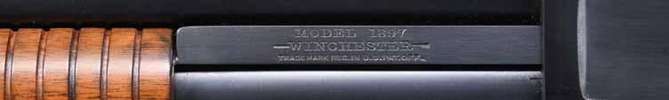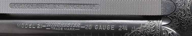 2796. CASED WINCHESTER MODEL 21 GRAND AMERICAN BBL. SET. Cal. 12 Ga. 2-3/4”. S# 32795. The 30” Grand American barrels are fitted with raised ventilated ribs, engraved “CUSTOM BUILT BY WINCHESTER FOR EARL B. FENSTON”. 3” triangles of scroll engraving are at the breech ends. Engine-turned barrel flats are stamped with S#, gauge, and choke info. Barrels are marked for IMod and full chokes. MEASUREMENTS: BBLS: 12 Ga. Bore Diameter: L .729. R .730. Restriction: L .033 (full); R .020 (mod). Wall thickness: L .030. R .029. Barrels are accompanied by their original beavertail ejector forend with an inlet ebony tip that is “B” carved. The number “2” is stamped on the barrel loop, front of the engine turned iron, and wood in front of S#. UNATTACHED ACCESSORIES: bbls. are housed in a tan leather factory-type case for two barrel sets, which has a leather-trimmed outer cover with a rectangle on top embossed “E.B.F.” These initials are also on top of the case. Case is lined in blue cloth and has a Winchester 21 label in the lid. Also included is a Winchester factory letter confirming Grand American barrels as a #2 set, and they were completed on June 29, 1965. Case is very fine. Smooth, unmarked leather is protected by its outer cover, which shows rubs and losses in leather. Interior cloth is fine with some rubs and light soiling. Label has one deep rub in the lower left corner. CONDITION: exceptionally fine, close to “as new”. Bores are bright & shiny, without any noted imperfections. (02-17930-2/MGM). $1,500-2,000.