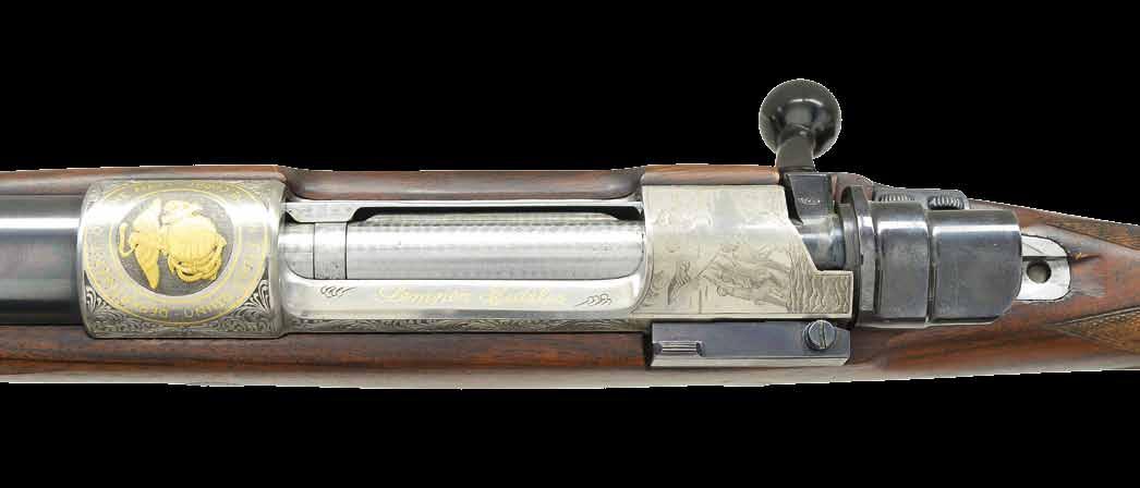 with sleeved on sling eye & front ramp holding small silver bead with sight protector. numbers are on bottom of bbl., and matching assembly numbers “543” are on the bbl. & removed). Top of the bbl . is engraved “No 1380 Griffin & Howe, Inc. New York”. Springfield 1903 action with serial number removed is fitted with a bolt marked “NS”, which is stamped with assembly numbers matching both bbl. & action. Action is fitted with a Lyman 48 receiver sight. Bolt has two panel-checkered knobs. Flag safety is marked “READY” and “SAFE”. Receiver ring is engraved with a simple heraldic US eagle, and a shield is on the bolt root. Original military trigger is retained. Unnumbered bottom metal is case-hardened and engraved with full coverage, a well-cut, shaded small scroll accented by bursts of high relief renderings of rose blossoms, essentially a Kornbarth signature. This fine scroll & rose surround an ovate central scene on the floorplate of a bull & cow moose wading in a swamp with large trees in the background. Stock of lightly figured, light-colored European walnut measures 13 1/4” over engraved & checkered steel buttplate with trap. Steel gripcap is engraved, matching the bottom metal with a small scroll surrounding a depiction of a grouse perched on a branch. Stock also features a shadowline right-hand cheekpiece with a secondary bead, point pattern checkering at the grip & around the forend, horn forend tip, a sling eye, & vacant gold oval on the toeline. CONDITION: bbl. and action retaining 90% custom rust blue. Case-hardening of the bottom metal faded to silver. Stock retains nearly