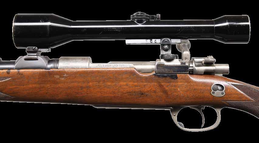 3,900 fps. Bbl. 28 1/2” tapered round of Bohler Special Steel. Bbl. is marked “Halger Waffen Hamburg”. Bbl. & left side of receiver are marked “Halger No. 111”. Ramp mounted bead front sight w/ island mounted standing V notch rear sight. “Carl Zeiss Jena Zielsechs No. 70658” scope w/ European 3 post reticle on claw mounts. M98 Magnum action w/ claw extractor & 3 position cocking piece safety. Turned down bolt handle has 2 panel hand checkering. Left side of stock is fitted w/ a Greener style side safety. Single set trigger is finely hand checkered. Hinged floorplate. Classic style sporter stock of European walnut. Features include point pattern hand checkering, steel grip cap & sling swivels, front swivel is bbl. band mounted. LOP: 13 3/4” to a checkered butt w/ horn, heel & toeplates. WEIGHT w/ scope: 10 lbs, 4 oz. CONDITION: bbl. retains over 95% lightly faded blue showing muzzle wear. Action, floorplate & grip cap finish has faded to a mottled gray. Stock has worn finish showing dents & marks w/ spots of dark staining. Bore is bright w/ sharp rifling. Scope has clear optics. (24-747/DS). CURIO. $10,000-15,000.