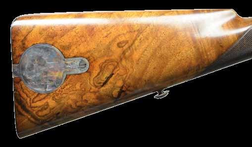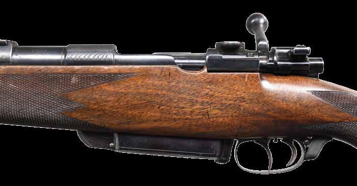 guard is horn. A flip up aperture rear sight is at top of grip with altered sear to prevent binding. Sunburst horn capped pistol grip stock of nicely fiddle figured European walnut measures 14-1/4” over ribbed horn buttplate. Stock features right hand cheekpiece, point pattern checkering on grip and forend and a steel cartridge trap on toeline with space for a 5 rd. stripper clip. CONDITION: very good to fine. Barrel with most of its original blue. Action with a considerable amount of case hardening color. Stock with old finish with newer varnish slopped on. Checkering shows considerable wear. Bore is shiny but shows considerable wear. Action is smooth. Mechanically good. Horn of trigger guard is repaired at front of bow. (23-6992/MGM). CURIO. $1,200-1,800.