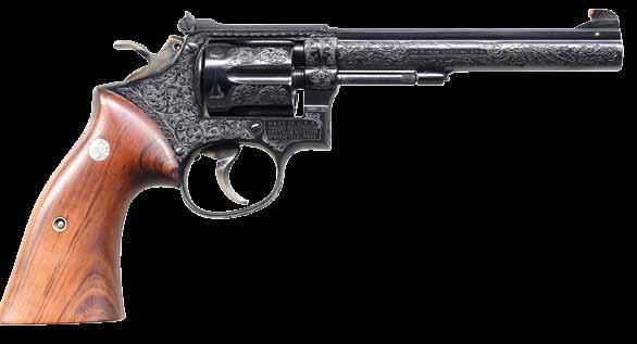 embellished by Griffin & Howe. The top of the bbl. is engraved “GRIFFIN & HOWE”, with the model and cal. designations, as well as the Winchester trademark logo marked on the left, and with Winchester’s mfg. information marked on the right. The original cal. designation “22 HORNET” has a light wavy engraved through the center, with the cal. designation “222 REMINGTON” marked below the Winchester trademark logo. Top of bbl. exhibits sections of professionally executed scroll and oak leaf engraving, which is also present on the left side of the scope mount. Bolt handle has been slightly swept back, featuring scroll engraving over the top of the handle, which terminates in an acorn knob that features 6 checkered oval panels around its circumference. Trigger guard features scroll engraving with what appears to be a “JD” monogram at the center. Floorplate with en suite engraving, featuring a scene of a buck at the center. Receiver, bolt handle, bolt shroud, bbl., scope mounts, trigger guard, floorplate, and checkered buttplate exhibit a blue finish overall. Jeweled bolt body with case color hardened grip cap. Finely figured checkered wood pistol grip buttstock features a cheek rest, wrap around checkering at the forearm, and an ebony forearm tip, with the aforementioned grip cap and buttplate both featuring trapdoors. Matte ramped and hooded blade front sight. Rear sight dovetail is fitted with a slot blank. Receiver is mounted with a Weaver K4 60-B scope. CONDITION: fine, with metal components retaining virtually all of their finishes overall, save for a few light superficial handling marks. Mirror bore, exhibiting sharp and well defined rifling throughout. Stock is excellent, showing few minute superficial marks from handling and storage overall. Scope retains a clear and sharp optic. An exceptionally attractive Griffin & Howe customized Winchester Model 70 bolt action rifle. (24-2031/MLW). MODERN. $3,000-4,000.