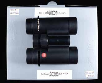 2795. LEICA ULTRAVID 10X32 BINOCULARS. S# 1620586. Model 40291. Comes with a matching box, case, and paperwork. UPC: 4022243402911. CONDITION: near excellent matte black exterior, with clear and serviceable optics. The box is very good, with retailer stickers. PROVENANCE: the Collection of Gun Sport Ltd owned by Jon R. Thomas. (02-20719/MD). $700-1,400.