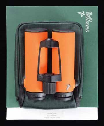 2768. SWAROVSKI OPTIK EL O-RANGE 10x42 BINOCULARS. S# T902767752. Orange exterior w/ laser range-finding. Comes comes w/ matching box containing paperwork, a field bag, & other accessories. UPC: 708026700163. CONDITION: near excellent finish w/ clear & serviceable optics; range finding functional. Case is very good, w/ retailer stickers. PROVENANCE: the collection of Gun Sport Ltd., owned by Jon R. Thomas. (02-20686/MD). $2,500-3,250.