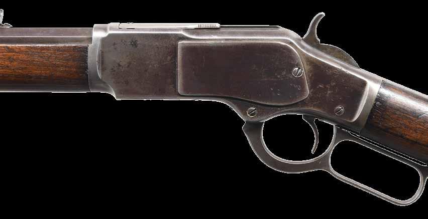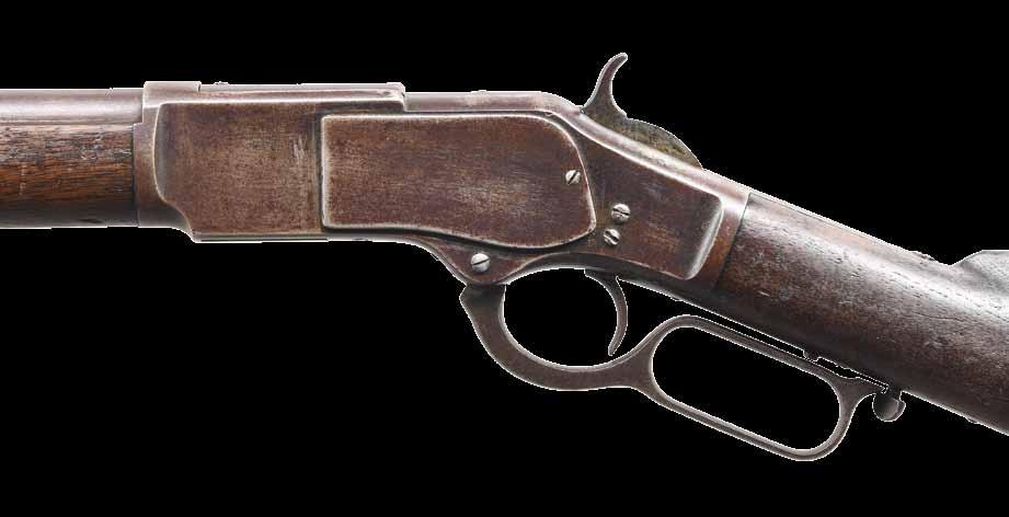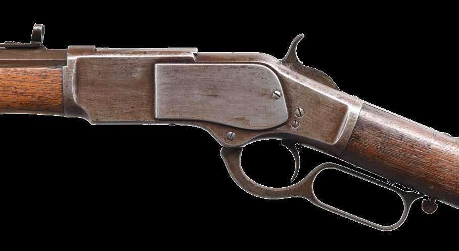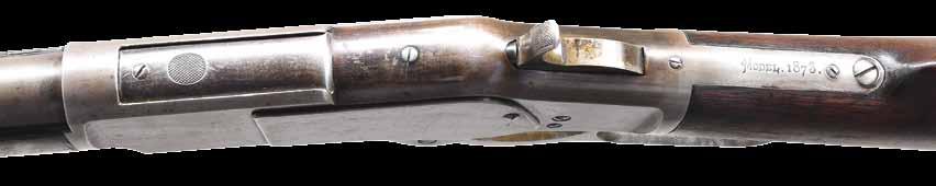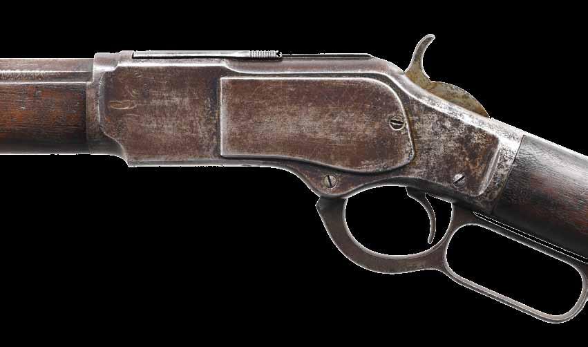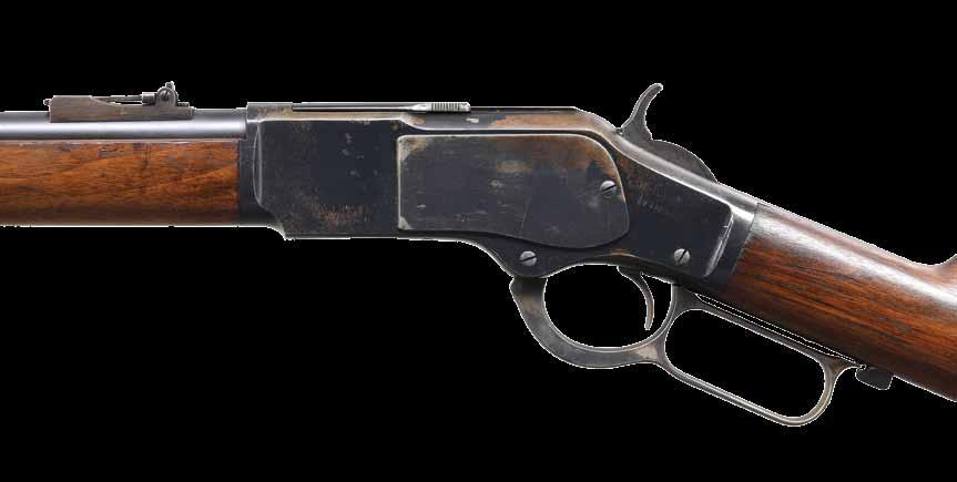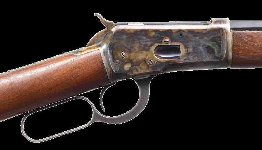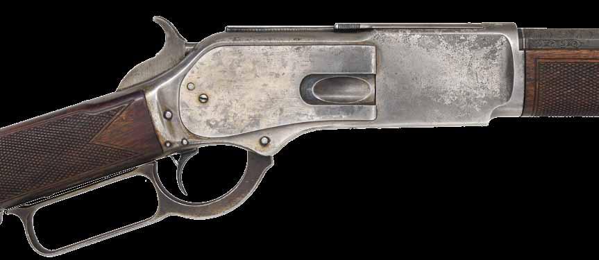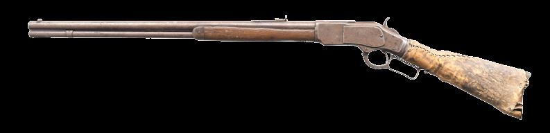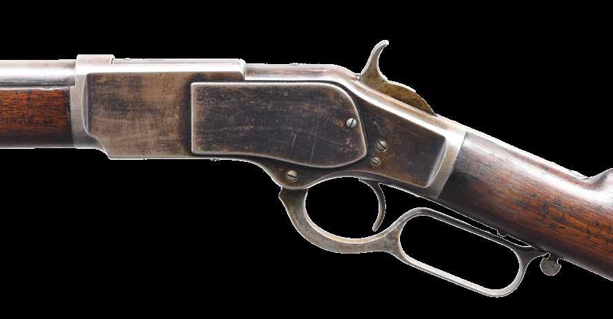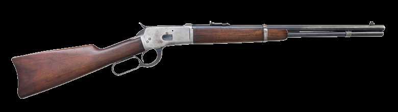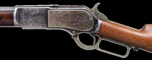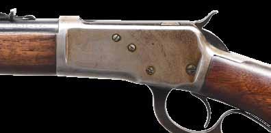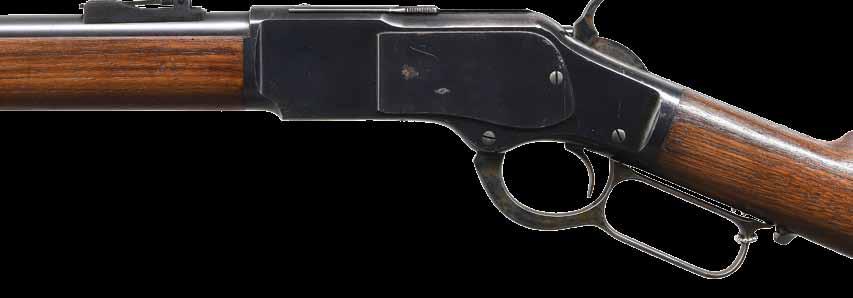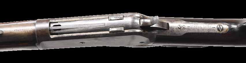 action. Walnut forearm and straight grip stock with crescent steel buttplate. Period aftermarket swivels. CONDITION: bbl. and mag. tube retain 80% lightly worn blue, showing spotted, light corrosion. case colored action is fading to gray/brown with spots of corrosion and light pitting. Wood shows wear with numerous scratches and marks. Stock is chipped at toe. Bore is dark with worn rifling. (24-4752/DS). CURIO. $1,000-1,500.