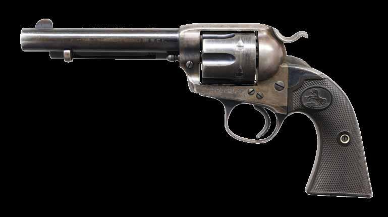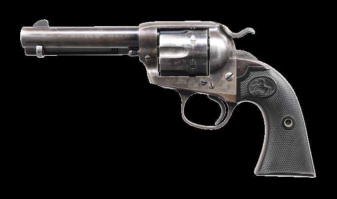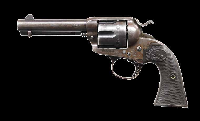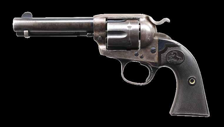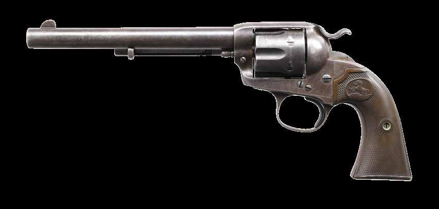 3224. COLT BISLEY FRONTIER SIX SHOOTER SA REVOLVER. S# 202037. Bbl. 4 3/4”. Six shot fluted cyl. Blue & case colored finish. 2 piece checkered hard rubber rampant colt grips. Frame, trigger guard & backstrap have matching numbers. Mfg. 1901. CONDITION: metal has faded to a brown patina showing dents & marks on bbl., cyl. & ejector housing. Front sight has a slight bend. Grips show moderate wear w/ chips at butt. Action is tight retaining 4 clicks. Dark lightly pitted bore w/ worn rifling. PROVENANCE: From the lifelong collection of Jerry Senter. (24-812/ DS). CURIO. $1,500-2,250.