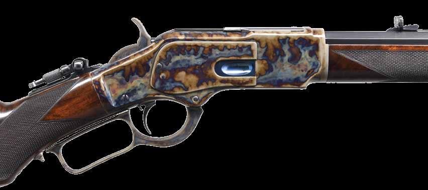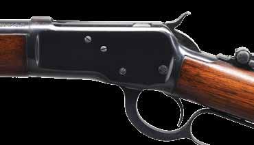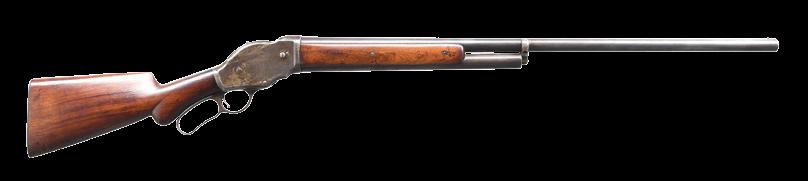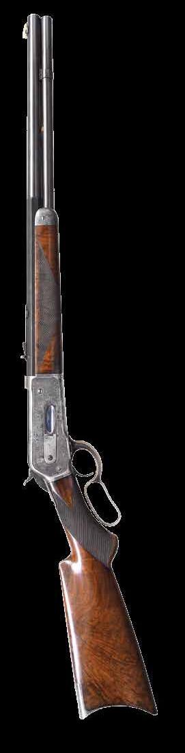 sight. Action features brass rotary magazine w/ left side shell counter, cocking indicator & bent tab safety. Top tang is drilled for sight attachment. Blue finish w/ case colored lever. Schnabel tipped forend & hard rubber capped pistol grip checkered walnut stock w/ grooved steel buttplate. CONDITION: 95% metal finish showing spots of freckling on left side of action. Very good wood finish. Bright near excellent bore. (24-5784/DS). CURIO. $800-1200.