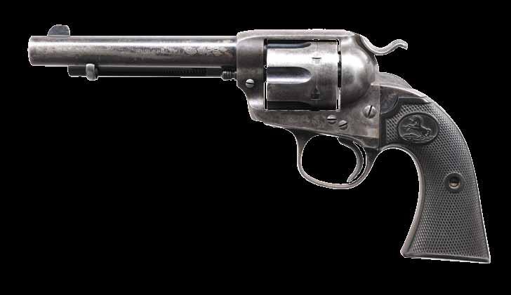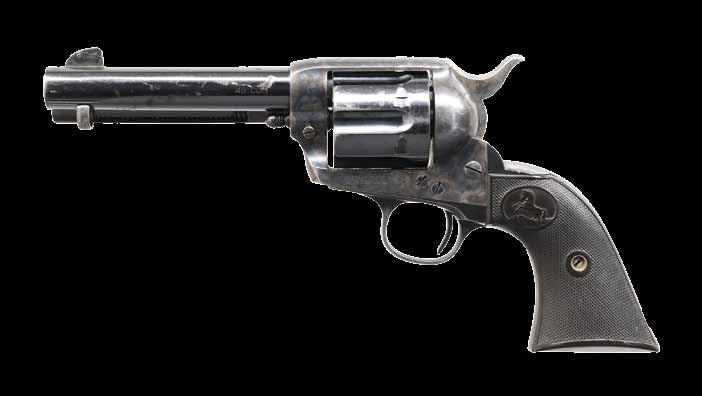 3223. COLT SAA 1st GEN REVOLVER. 178657. Bbl. 4 3/4”. Six-shot fluted cyl. Blue and case-colored finish. Two-piece checkered hard rubber rampant colt grips. UNATTACHED ACCESSORIES: letter from Colt’s Manufacturing Company, Inc detailing the following information, “Serial Number: 178657 / Caliber: .38/40 / Barrel Length: 4 3/4” / Finish: Blue / Type of Stocks: Rubber / Shipped To: Simmons Hardware Company / Address: St. Louis, Missouri / Date of Shipment: June 1, 1898 / Number of Same Type Guns in Shipment: 10”. CONDITION: metal has faded to gray-brown, showing scattered, light pitting. Grips have worn checkering with handling marks. Sound action. The pitted bore retains intact rifling. (01-25751/DS). ANTIQUE. $1,500-2,500.