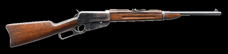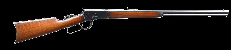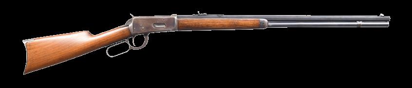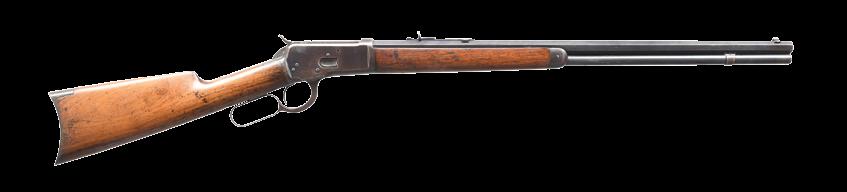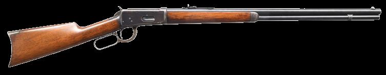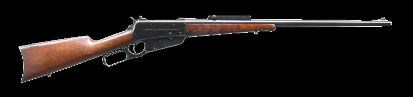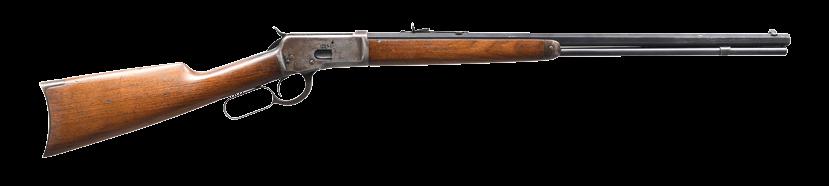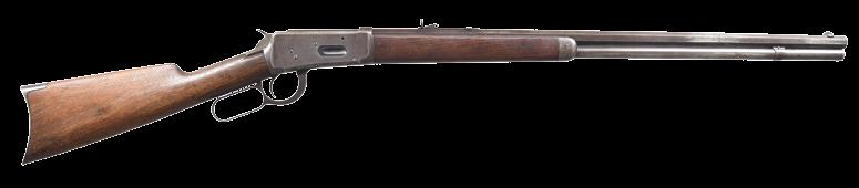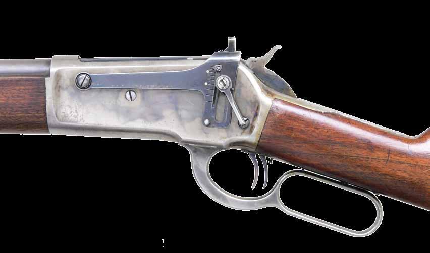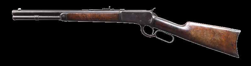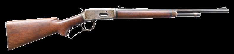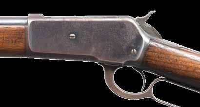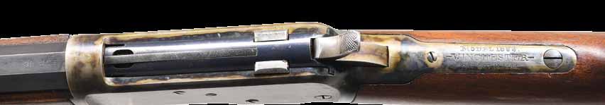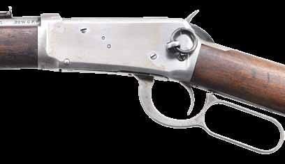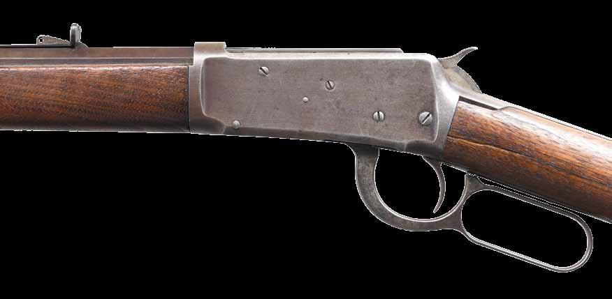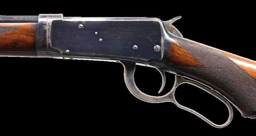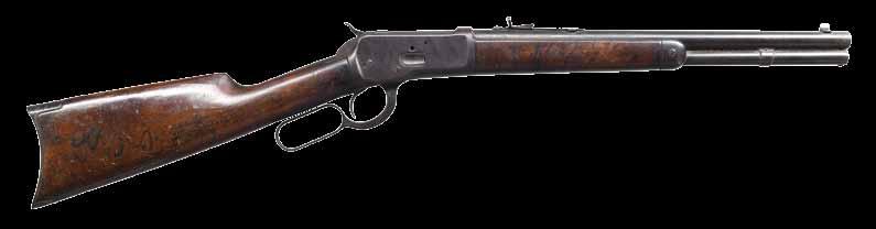rear sight. Action features a brass rotary mag., cocking indicator & bent tab safety. Blue finished w/ case colored lever & crescent steel buttplate. Schnable tipped forearm & straight grip walnut stock. Mfg. 1910. CONDITION: over 70% dull lightly faded blue showing edge & carry wear w/ spotted finish loss on action. Lever retains 50% case colors on its sides. Buttplate has faded to gray. Refinished stock & forearm show scratches & marks. Stock has large repaired cracks extending from the top tang & on the right side of the wrist w/ an added wood repair & chip at the lower left side of the action. Dark bore retains lightly worn rifling showing some light pitting. (24-4730/DS). CURIO. $1,500-2,000.