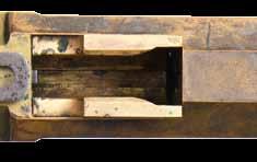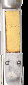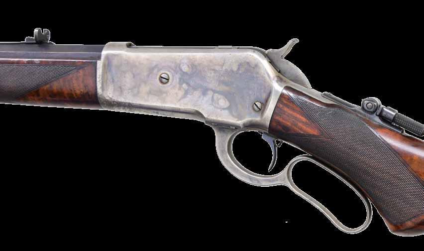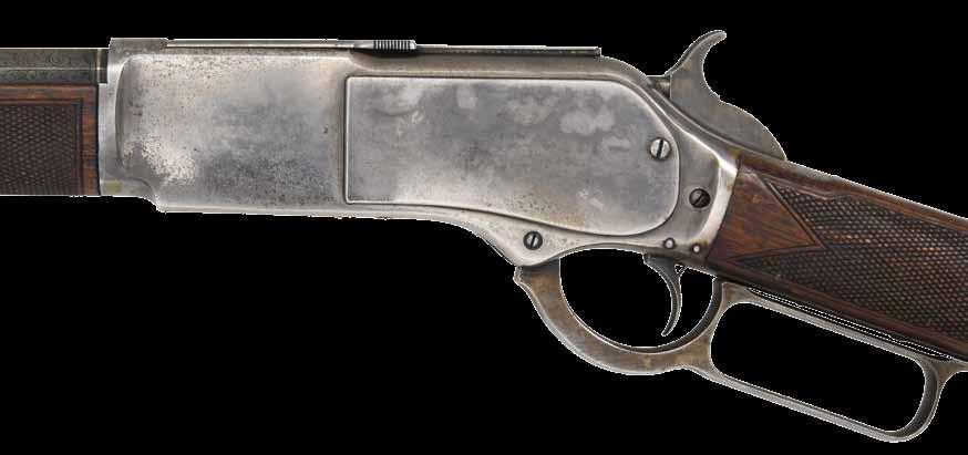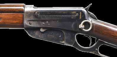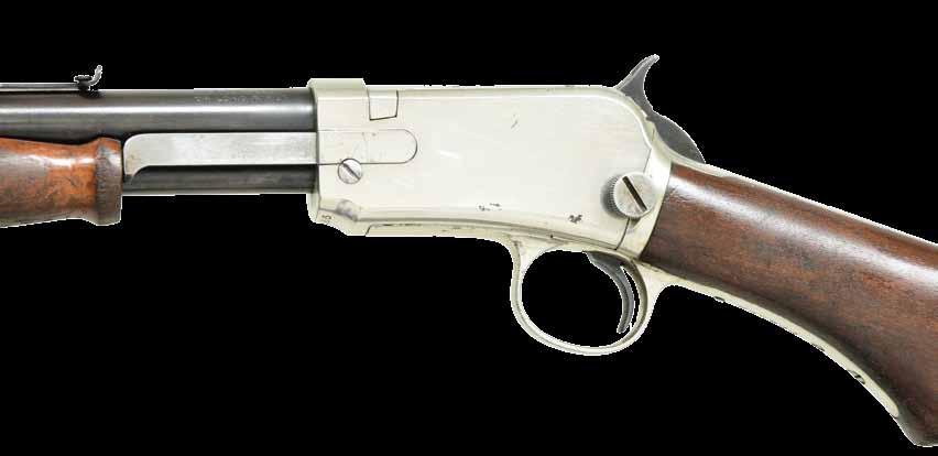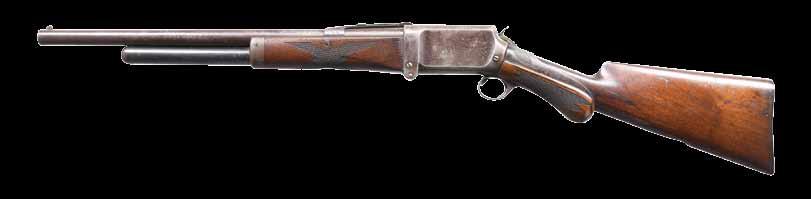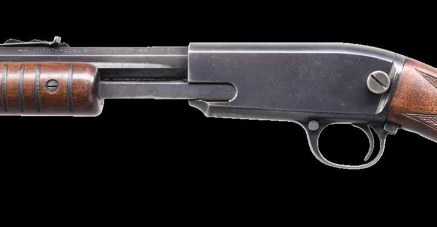 dot backgrounds & dbl. line borders. Takedown screw head is engraved in a floral pattern. The hammerless action features a case colored breech block, jeweled slide bar, hand checkered trigger, right side slide release & top tang safety. Bbl. 24” oct. Gold ring front sight. Spirit level rear bbl. sight & combination tang sight. Tubular mag. Sm. tapered pump handle & straight grip stock of fancy walnut w/ burl grain. Features include point pattern hand checkering & crescent steel buttplate. The Meriden Fire Arms Co. produced firearms in Meriden, CT. from 1905-1918. The company was formed when Sears, Roebuck & Co. purchased the Andrew Fryeburg & Son Firearms Mfg. plant & moved the machinery to Meriden. The company’s firearms were sold through the Sears catalogue as well as other retailers. The Meriden Model 15 slide action rifle was introduced in the fall of 1912 & is based on Savage patents. This design was later mfg. by Savage & known as the Model 29. CONDITION: bbl. & action retain over 90% lightly worn blue showing edge wear. Bolt retains vivid green toned case colors. Original wood finish shows moderate wear w/ scratches & handling marks. Sound mechanics. Bore has slightly darkened appearance retaining sound rifling. (24-940/DS). CURIO. $7,000-10,000.