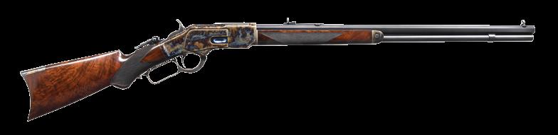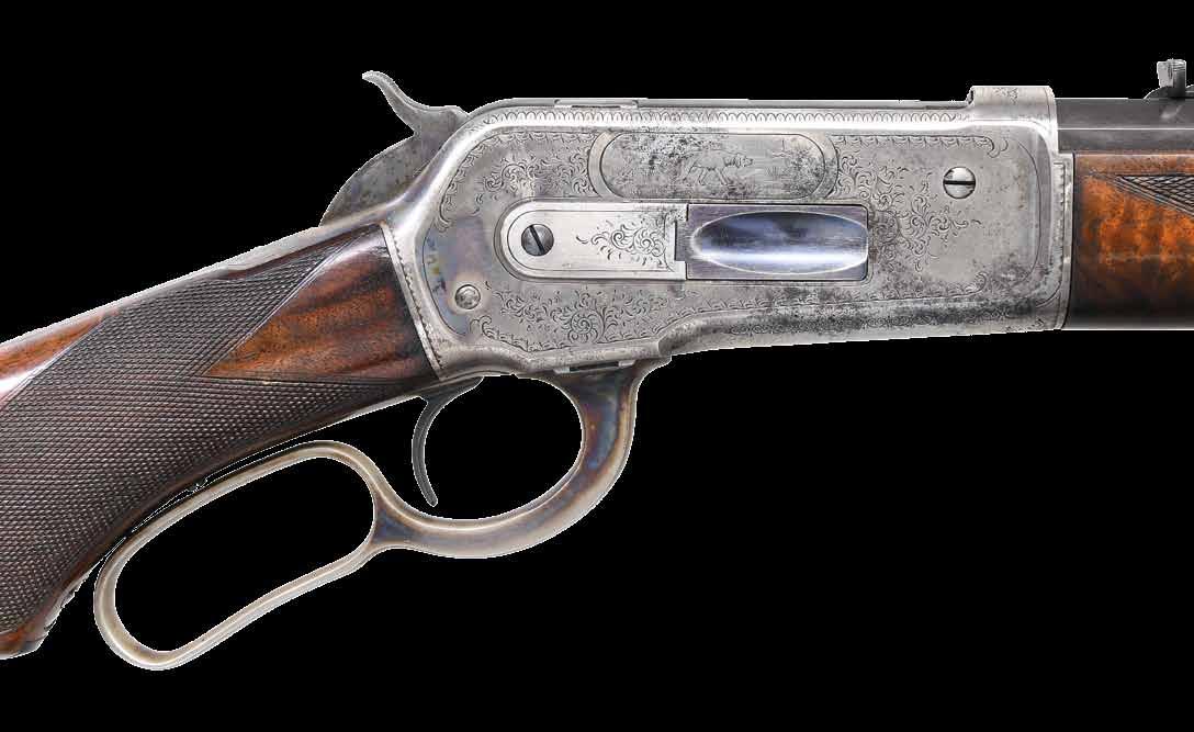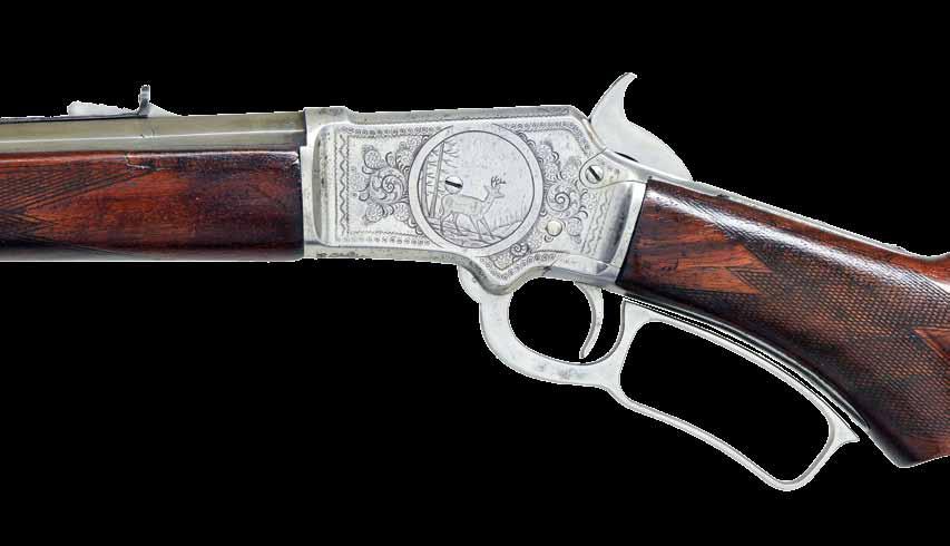 ENGRAVED GOLD & PLATIMUM INLAID DELUXE TAKEDOWN LEVER ACTION RIFLE. Cal. 25-20 Marlin. S# 135330. Bbl. 24” octagon to round. Bead front sight w/ sporting rear sight & combination tang sight. Half length takedown mag. Case colored action w/ full coverage No. 10 factory engraving. Engraving features vignettes of woodland scene w/ bull & cow elk on left side & squirrel perched on a branch on right side. Scenes are highlighted by gold inlaid borders & surrounded by leaf style foliate engraving w/ punch dot backgrounds. Upper & lower receiver areas have highlights & geometric borders that continue to the lever. The breech end of the bbl. is highlighted w/ 3 bands, 2 gold & 1 platinum. Sides of hammer have borderline engraving w/ platinum wire inlaid highlights. Forearm & S curve pistol grip stock of gloss finished fancy walnut w/ hard rubber buttplate. Style No. 10 hand checkering features oakleaf highlights at front of pistol grip checkering & rear of the forearm pattern. UNATTACHED ACCESSORIES: records check from the Cody Firearms Museum Records Office detailing the following information, “MARLIN MODEL 1894 - SERIAL NUMBER 135330 / Type: Rifle / Caliber: 25 / Barrel Type: 1/2 Octagon / Barrel Length: 24 inches / Pistol grip stock / Half magazine / Takedown / Date Shipped: April 12, 1897”. CONDITION: bbl. & mag. tube retain 80% lightly worn blue w/ scattered scratches & small spots of corrosion. Action, hammer & lever retain nicely visible case colors in largely protected areas w/ balance fading to gray showing small spots of corrosion & light pitting. Original wood finish shows small wear spots w/ scattered scratches, marks & small dents. Stock is missing a chip at the toe. Sound action. Bore is bright w/ strong rifling. PROVENANCE: From the Collection of a Tennessee Gentleman. (01-25635/ DS). ANTIQUE. $12,000-20,000.