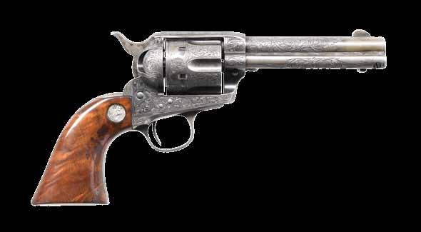 3220. COLT CUSTOM ENGRAVED 1ST GEN SAA REVOLVER. Cal. 41 Colt. S# 149714. Bbl. 4 3/4”. Six shot fluted cyl. Beautifully upgraded gun w/ full coverage vine type foliate scroll hand engraving w/ punch dot backgrounds & fancy borders. Nickel finish w/ fire-blued cyl. pin & screws. Custom 2 piece pearl grips. UNATTACHED ACCESSORIES: letter from Colt Archive Properties LLC detailing the following information, “Serial Number: 149714 / Caliber: .45/c / Barrel Length: Illegible / Finish: Blue / Type of Stocks: Not Listed / Shipped To: M. F. Kennedy and Brothers / Address: St. Paul, Minnesota / Date of Shipment: January 18, 1893 / Number of Same Type Guns in Shipment: 3”. Also includes unnumbered 1 piece box w/ picture label. Box contains bore brush. CONDITION: near excellent as restored, retaining virtually all renickeled finish. Very good grips. Action is tight retaining 4 clicks. Bore has a dark lightly frosted appearance w/ lightly worn rifling. PROVENANCE: From the lifelong Collection of Jim Williams. (01-25609/DS). ANTIQUE. $4,000-6,000.