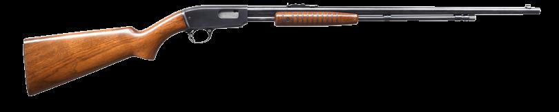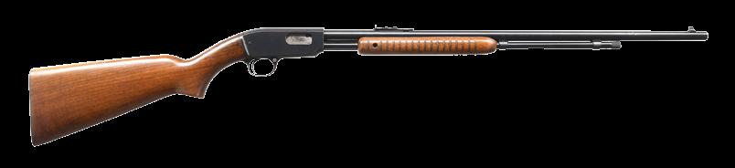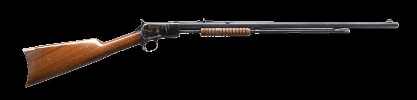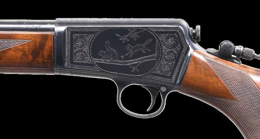 3150. CUSTOM ENGRAVED WINCHESTER MODEL 90 SLIDE-ACTION RIFLE. Cal. 22 Long. S# 795490. Bbl. 24” octagon w/ original sights. Tubular mag. Gold finished action is hand engraved in a design that is similar to factory no. 8 engraving. Vignette on right side of receiver features a running jackrabbit. Left side vignette depicts a woodland scene w/ a squirrel. Scenes are surrounded by vine type foliate scroll w/ stippled backgrounds. Complimentary engraving extends to upper & lower receiver areas as well as trigger guard, breech block & buttplate. Breech & muzzle ends of bbl. have gold bands accented by scroll highlights. Custom forearm & straight grip stock of nicely grained walnut have gloss finish & style H hand checkering. Bbl., mag. tube & small parts have a brilliant high polished custom blue. Total of 848,936 M1890 & M90 rifles were mfg. between 1890 & 1937. CONDITION: near excellent as upgraded retaining over 98% custom finish. Very good bright bore. (24-945/DS). CURIO. $3,500-5,500.