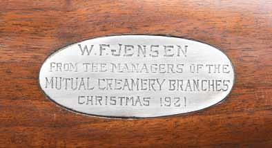 WALL CLOCK. The oak case measures 27” tall, 17-1/2” wide with an original 12” dial advertising the “Winchester Gun Company”. The clock was first manufactured by the Sessions Clock Company in 1908. The model was named “The Clinton” and it is estimated that this clock, with the original advertising dial, was made in 1920, give or take 5 years. The movement is stamped “Sessions” and will run in good order for 8 days. The movement has recently been serviced and should give decades of reliable service. CONDITION: the clock is 98% original including the hands, label, pendulum and the bottom glass that portrays the Winchester “W” trade mark. The top glass has been replaced. (02-23159). $1,200-1,500.