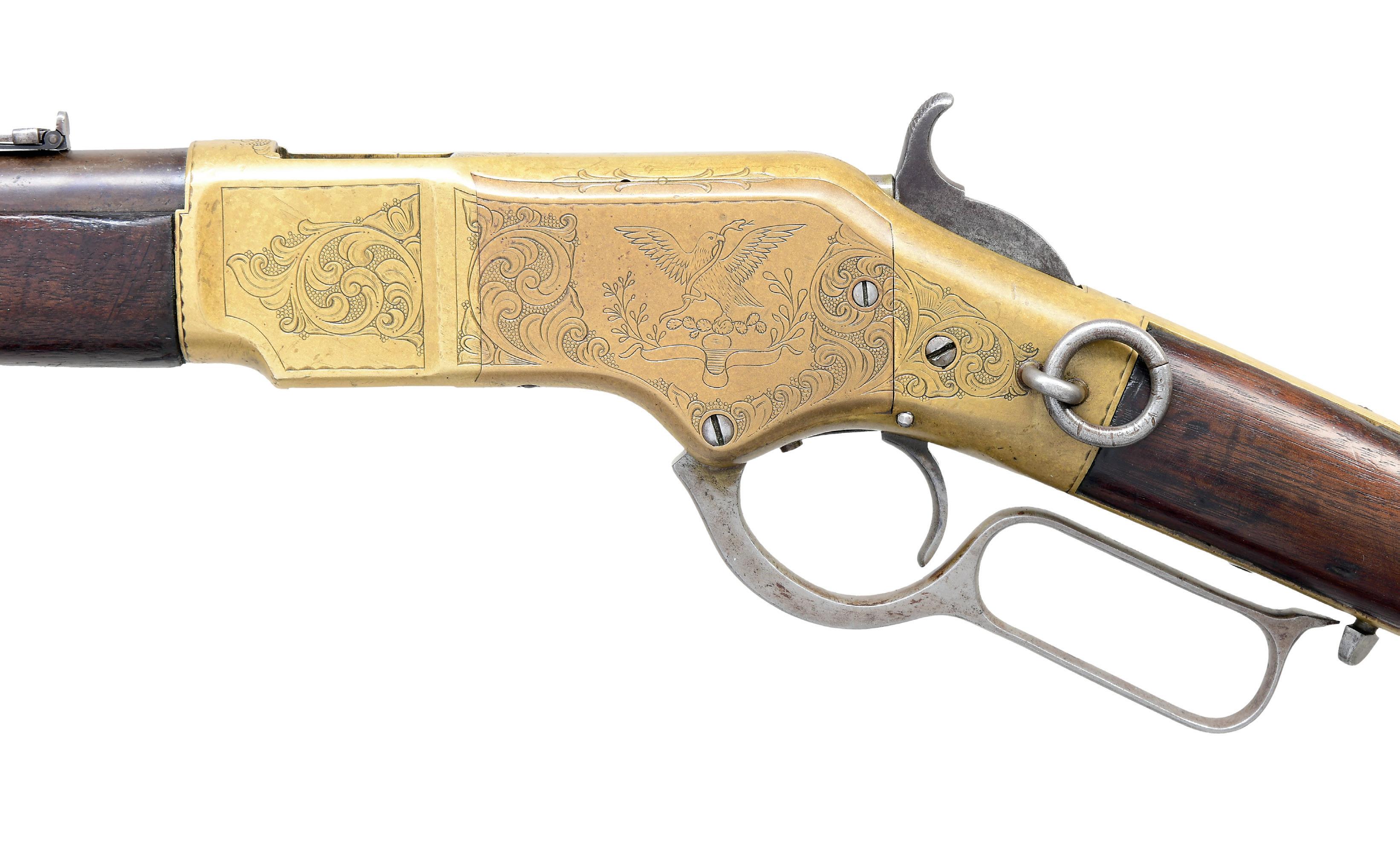 panel has a small repaired chip at the toe. Action shows some wear. The dark, lightly pitted bore retains intact rifling. (01-25750/DS). ANTIQUE. $2,500-4,000.