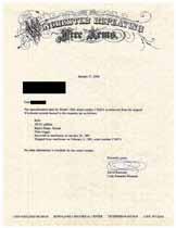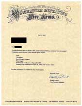 3207. VERY NICE RINALDO A. CARR (R.A.C.) INSPECTED COLT SAA CAVALRY REVOLVER WITH FACTORY LETTER. Cal. 45 Colt. S# 133583. Bbl. 7 1/2” with fixed blade front sight. Rinaldo A. Carr was a civilian employee and the principal Sub-Inspector for the final 2 Government contracts in 1889 and 1890. The known serial number range for these revolvers was 131,208-140,136. “RAC” inspector’s initials marked on frame, cyl, bbl. & bottom left of grip. “K” factory inspector initial found on end of ejector rod assembly, bbl. (beneath ejector housing), ahead of trigger bow & on bottom of grip frame. “P” proof marked on bottom of barrel & side of cyl. “O” marked in hammer slot. Matching numbers appear on frame, trigger guard frame, butt, cyl. & bbl. Frame marked on left side “US” with 3 line 3 date patent markings. 1 Line block letter barrel address. Blued bbl., 6 shot fluted cyl. & grip frame. Case hardened frame & hammer. “Donut hole” ejector rod head. One piece walnut grip, with correct “RAC” stamped on bottom and no cartouche on sides, indicative of arsenal replacement. UNATTACHED ACCESSORIES: Colt factory letter stating the following: “Serial Number: 133583/ Caliber: .45/c/ Barrel Length: Not Listed/ Finish: Blue/ Type of stocks: Not Listed/ Sold To: United States Government/ Delivered to U.S. Government Inspector/ Address: located at the Colt plant/ Date of Shipment: June 16, 1890/ Number of same type Guns in shipment: 150”. CONDITION: overall very good plus. Bbl. & ejector rod housing retain 90% original blue with high edge wear & areas of mild thinning. Cyl. blue. Frame & hammer retain 40% original case colors; bright & vivid in protected areas with areas of mild brown patina. Grip frame has faded to gray. Cyl. pin retaining screw shows minor wear from improper screwdriver use, remainder of screws are crisp. Grips appear very good with slight shrinkage at heel & toe due to age. Bore retains sharp rifling with scattered areas of moderate pitting. A very good example of a U.S. Cavalry SAA. (01-25557/ BH). ANTIQUE. $17,000-22,000.