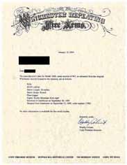 3208. COLT 1ST GEN SAA REVOLVER. Cal. 22 WCF. S# 1817. Starting in August of 1875, approx. 1,850 SAA revolvers were produced in 44 RF cal. in their own serial number range. Due to decreased demand in 1888, approx. 100 of these were converted to 22 RF, & 1 to 32 RF. No other cals. have been documented. New bbls. & cyls. were fitted & the trigger guards were restamped 22 cal. It is unknown who or when this revolver was rechambered to 22 WCF. Bbl. 7 1/2” w/ a lowered front sight. Six shot fluted cyl. 2 piece checkered hard rubber eagle grips. UNATTACHED ACCESSORIES: letter from Charles B. Layson, contributing editor “SAA Revolvers”, “The Blue Book of Gun Values”. 2 page letter detailing the history of the rimfire Colt SAAs & talking of Mr. Layson’s opinion of this revolver. CONDITION: metal has faded gray appearance w/ scattered light pitting. Front receiver ring shows light wrench marks. Grips show moderate wear. Action is tight w/ all 4 clicks remaining on hammer. Pitted bore retains largely intact rifling. (01-25141/DS). ANTIQUE. $5,000-8,000.