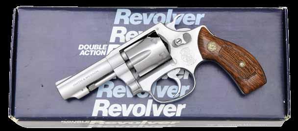 3516. SMITH & WESSON MODEL 50 DA REVOLVER. Cal. 38 Spl. S# 933J69. Bbl. 2” pinned. Ramped serrated blade front sight. Adjustable square notch rear sight. J-frame revolver mfg. 1955-1975. 5-shot cyl. Blued finish w/ case colored trigger & hammer. Checkered walnut grips w/ silver S&W medallions & matching stamped number on right panel UNATTACHED ACCESSORIES: matching numbered factory box. CONDITION: grips show a couple light handling marks. Hammer & trigger retain nearly all their vibrant case colors w/ some light operational wear. Balance of metal retains 98% original blue w/ a light drag line on cyl. & a couple light handling marks. Action functions properly when hand cycled. Bright very good plus bore. (24-2585/MJC). MODERN. $1200-1800.