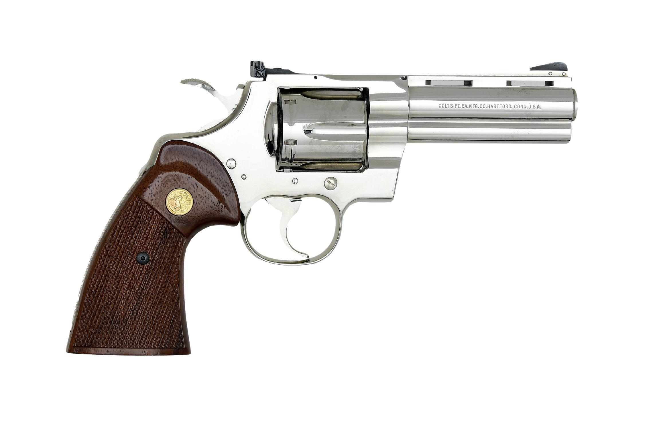 UNATTACHED ACCESSORIES: unnumbered factory box in fair condition with manual, paperwork, cleaning kit, and Pachmayr Presentation grip. CONDITION: grips have a varnish finish with some light handling marks. Trigger and hammer retain most of their case colors with some operational wear. Balance of metal retains 95-97% of its original blue with a drag line on cyl. and some scattered edge wear. Action functions correctly when hand-cycled. Very good+, bright bore. PROVENANCE: from the lifelong collection of Jim Williams. (24-2664/MJC). MODERN. $800-1,200.
