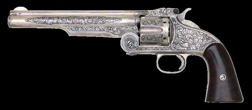with blade front sight. 6 Shot fluted cyl. Revolver features full coverage foliate scroll engraving lightly filled with gold filigree. Left recoil shield has side facing male lion. Loading gate has side facing lioness. Balance of metal is nickel with hammer with hammer, cyl. latch pin & action screws appearing niter blue. 2 Piece mother of pearl grips. CONDITION: very good as refinished at time of engraving. Metal features 97% reapplied nickel. blued parts exhibit some thinning finish. Approx. 1” finish scratch on left side of hammer. Very good grips have a few small chips at edges. Bright bore with sharp rifling. Trigger pull has been lightened. (24-1825/BH).