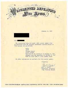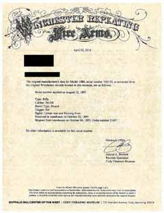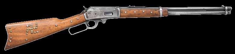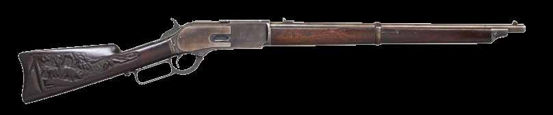 3175. NRA SILVER MEDAL AWARDED BUFFALO BILL’S 1897 FACTORY ENGRAVED MARLIN RIFLE & WILD WEST SHOW ARCHIVE. The Stagecoach Museum of Shakopee, Minnesota was founded in March, 1952 by the Klavestad family. It originally housed a small restaurant as well as the gun collection. The gun collection featured many historically significant firearms including a John Brown sharps rifle & pieces with provenance to Buffalo Bill Cody, Annie Oakley & Calamity Jane among others. The many rare firearms of the museum are documented in the book “The Stagecoach Museum Gun Collection” published by Ray S. Saign, Richard Donaldson & Fred Fiet. Pictured on page 21 of the book is the Marlin 1897 engraved & gold finished rifle. The caption states “Purchased from William F. Buffalo Bill Cody in St. Paul Minnesota in 1911 by Mr. Claus Klavestad for his son, Osborne, while they were attending Cody’s Wild West Show”. In addition to being pictured on page 21, this rifle also appears on the inside cover along with Annie Oakley’s Stevens rifle which sold for $516,000 in a 2020 auction along with some ephemera displayed on same pages This high grade Marlin 1897 is cal. 22 S, L, LR. S# 194721. Bbl. 24” octagon to round. Rocky mountain front sight w/ filler in rear dovetail. 2/3 length tubular mag. Action has style No. 10 factory engraving. Circular vignette on the left side shows a woodland scene w/ white tail buck. Balance of action has arabesque scroll engraving w/ fancy borders. Action & forearm cap are gold plated. Forearm & S curve pistol grip stock of fancy walnut have hard rubber buttplate & grade D checkering. UNATTACHED ACCESSORIES: “TEN BEST ARMS AWARDS” plaque from the 1997 NRA show won by this Marlin rifle. Plaque includes description of the rifle & a silver NRA medal. Brass Stagecoach Museum tag No. 130 as pictured on the rifle on page 21 of the Stagecoach Museum Gun Collection book. Affidavit of provenance of purchase from Buffalo Bill Cody by owner of Stagecoach museum, Osborne Klavistad and his father. Marlin factory letter confirming configuration. CONDITION: bbl. & mag. tube retain over 90% original blue. Action shows 60% gold finish. Original wood finish shows scattered scratches & marks. Stock & buttplate exhibit alteration at toe & have been shaved flat for 2 3/4” into the stock. Dark lightly pitted bore w/ worn rifling. ASSOCIATED BUFFALO BILL MEMORABILIA CONSISTING OF: 1.) Lithograph poster of Buffalo Bill in his Wild West Show clothes mounted on a white horse w/ flaring nostrils & flowing white mane. The colored poster is captioned “BUFFALO BILL’S WILD WEST” at top & “SELLS FLOTO CIRCUS” at bottom. Image size 40” x 26 1/2”. Poster is in a board frame w/ plexiglass front. (Pictured inside cover of Stagecoach Museum Gun Collection book with rifle. 2.) Two framed 13.5” x 9.5” original watercolor painting illustrations by Robert Prowse (1858-1934) for BUFFALO BILL NOVELS # 34 (1919) and #142 (1923) 3.) 1902 color Illustrated “COL. W.F. CODY / BUFFALO BILL / HISTORICAL SKETCHES / AND PROGRAMME” 9.5” x 7.25” (pictured inside cover of Stagecoach Museum Gun Collection book with rifle) 4.) 43’ 34” color sheet of scenes from Buffalo Bill show, dated in pencil Aug. 1891 5.) 4 framed items including covers from Buffalo Bill weekly publications, 9.5” x 8” original Robert Prowse watercolor illustration with Indian & cowboys 6.) 8 copies of different editions and venues of “Buffalo Bill’s Wild West” Programs, 1902-1918 7.) 4 different issues “WILD WEST WEEKLY” 1913-1914 8.) 3 different issues of “BRAVE and BOLD WEEKLY” 1909 9.) Group of books. Titles include: “Life and Adventures of Buffalo Bill” 1927, 2 different editions of “Buffalo Bill Wild West Annual”, “A Peep At Buffalo Bill’s Wild West”, “Buffalo Bill’s Wilder Westen (German Language Edition)” 10.) Assorted magazine articles, and post cards. PROVENANCE: Formerly on display at the Stagecoach Museum. Formerly from the collection of Steve Farfaro. (24-4698/JS & BH). CURIO. $40,000-60,000.