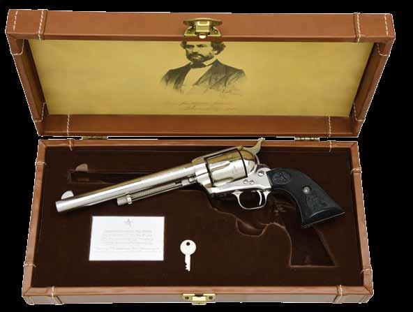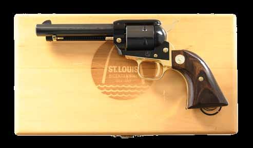 125. Bbl. 7 1/2”, round with octagon shaft. Sixshot round, Texas Ranger scene, roll-engraved cyl. Frame, bbl., loading lever, and grip straps have vine-type foliate scroll hand engraving in the style of Gustave Young. Hammer has wolf’s head engraving. Left side of bbl. is marked “IN COMEMMORATION OF COL. / SAMl COLT & THE GREAT EXHIBITION OF 1851”. Bbl. and cyl. have a brightly polished blued finish. Frame, hammer, and loading lever are case-colored. Square back trigger guard and backstrap have a silver finish. One-piece walnut grips. Sterling silver oval plate on left panel is inscribed “ROYAL / ARMOURIES / AT THE / TOWER OF LONDON”. Limited issue of 1,000 mfg. in 1989 by ASM for the US Historical Society. UNATTACHED ACCESSORIES: wooden presentation case with blue velour fitted interior. Case contains powder flask, 2-cavity mold, cap tin, nipple wrench, and case key. Brass plate on the lid commemorates this special edition made for the Tower of London Royal Armouries. CONDITION: appears unused, retaining nearly all original finish. Bright, near excellent bore. (01-25800/DS). ANTIQUE. $1,500-2,500.