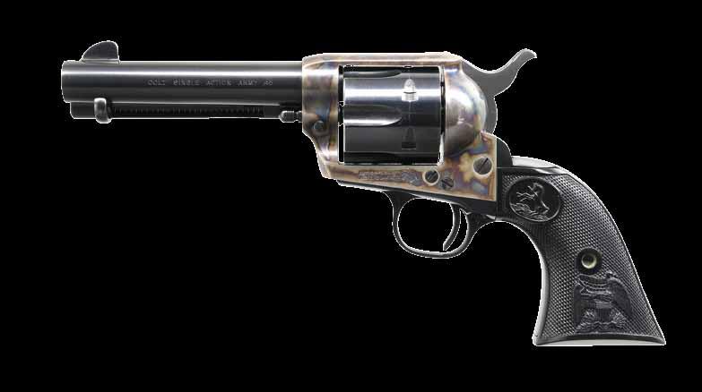 3237. COLT 1ST GEN SAA REVOLVER. Cal. 45 Colt. S# 356026. Bbl. 4 3/4”. Six shot fluted cyl. Blue & case colored finish. 2 piece checkered hard rubber rampant colt grips. Mfg. 1940. UNATTACHED ACCESSORIES: 1 piece box w/ matching serial number & label. Box contains Shooting Suggestion pamphlet. Box has tattered edges w/ 2 torn corners on lid. CONDITION: over 90% lightly worn blue & case colored finish showing a cyl. drag line. Grips show light wear w/ small chips at butt of left panel. Action is tight retaining 4 clicks. Very good bore. PROVENANCE: From the lifelong Collection of Jim Williams. (24-2679/DS). CURIO. $4,000-6,000.