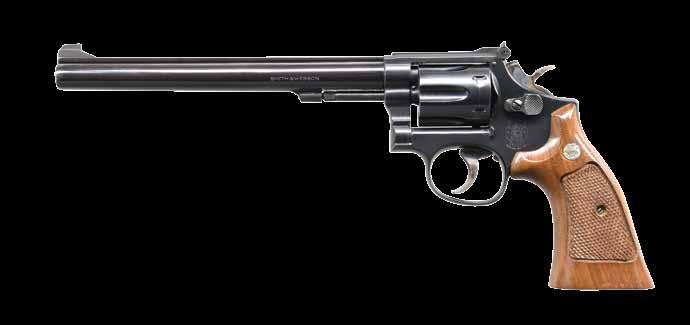S# K69580. Bbl. 6” pinned. Patridge front sight. Adjustable square notch rear sight. Five-screw K22 revolver mfg. 1948. Matching numbers on frame, bbl. cyl. & extractor. Blued finish with case colored trigger & hammer. Unnumbered checkered walnut target grips with silver S&W medallions. CONDITION: grips show some handling marks. Trigger & hammer retain most of their case colors w/ some fading & a spot of oxidation. Balance of metal retains 90% original blue with scattered edge wear, light oxidation & some operational wear. Action functions properly when hand cycled. Bright near excellent bore.
