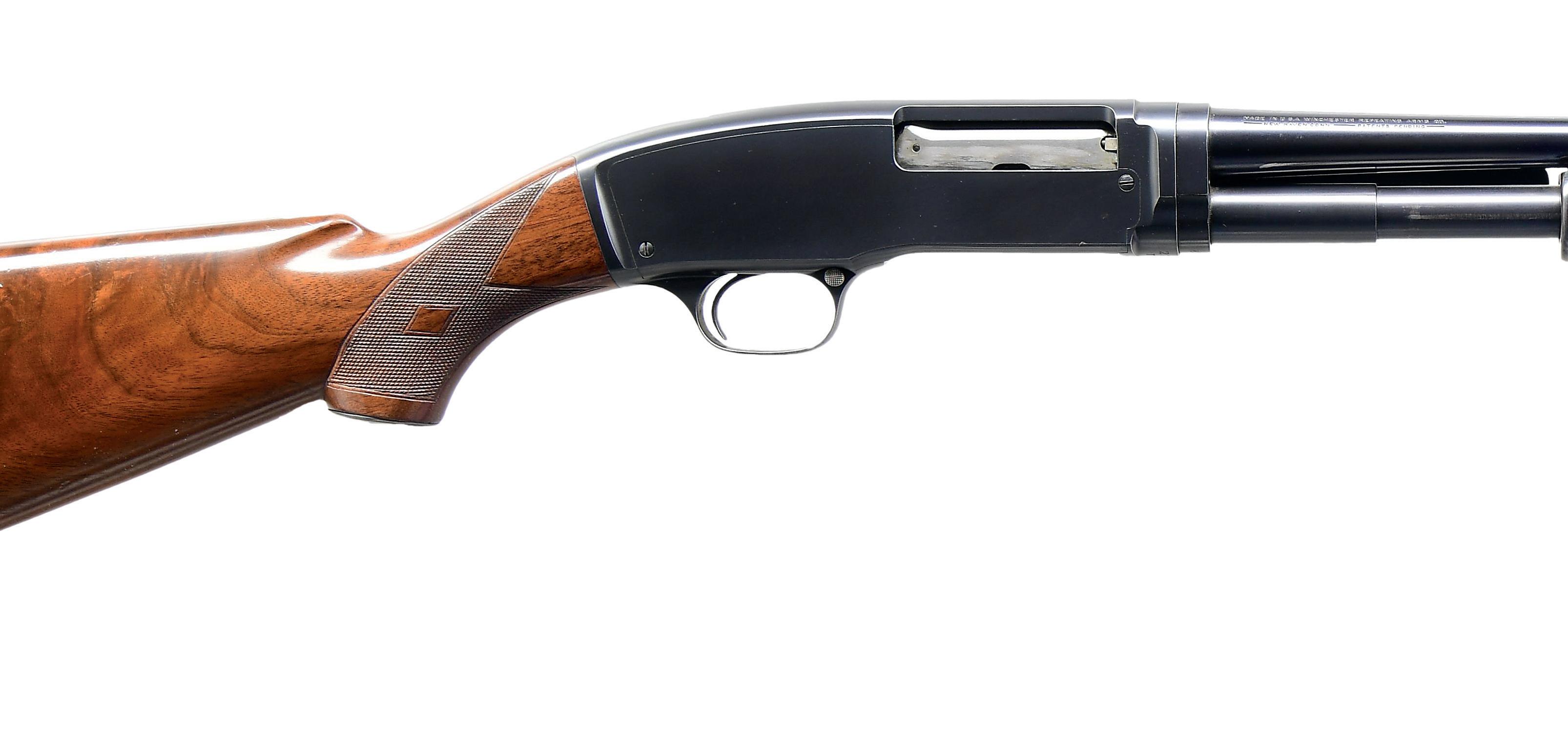 grooved forearm & pistol grip walnut stock w/ checkered steel buttplate. Mfg. 1947. CONDITION: over 90% blue showing slide & edge wear w/ spotted light corrosion. 1 forearm screw is missing. Stocks show light wear w/ scattered scratches & marks. Very good