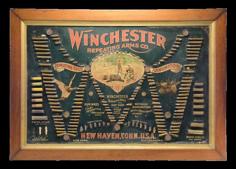 3169. WINCHESTER REPEATING ARMS CO DOUBLE W BULLET BOARD Early advertising board supplied to Winchester dealers. Label on back states, “PRESENTED WITH COMPLIMENTS / Winchester Repeating Arms Company / Please Hang In A Prominent Place”. Board displayed a full line of Winchester cartridges & shells in a double W formation w/ pictures of a flying mallard, moose & hunters w/ their Winchester rifles over a downed Grizzly. Images are set against a dark green background that measures 39 1/2” by 49”. Display is in a wooden frame w/ gold painted wood inner border. Framed size 40” x 57 1/2”. CONDITION: display shows light fading of the images w/ apparent water damage around the edges causing some raised surfaces & wear spots. Many cartridges show spots of corrosion & patina. Approx. 20 cartridges are missing or damaged. 1 detached replacement cartridge is also present. (02-22969/DS). NON-GUN. $5,000-8,000.