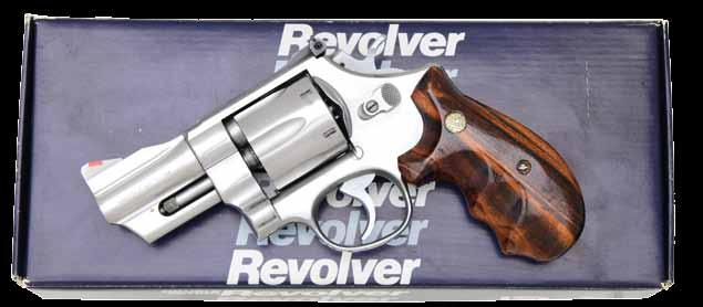 Spl. S# ALW2836. Bbl. 3”. Ramped serrated blade front sight w/ red insert. Adjustable square notch rear sight w/ white outline. Stainless finish. Goncalo Alves combat grips w/ silver S&W medallions. UNATTACHED ACCESSORIES: matching numbered factory box w/ cleaning kit, screwdriver, manual, paperwork, Pachmayr Presentation grip & S&W BLW-624 holster made for 3” 624 revolvers. Also included is a factory letter stating that this revolver was shipped to Lew Horton on July 10th, 1985. The letter also states only 5000 of these revolvers were made as a special order for Lew Horton. CONDITION: grips show some light handling marks. Metal shows a few light handling mark & some operational wear. Action functions properly when hand cycled. Very good plus bright bore. (24-3837/MJC). MODERN. $800-1200.