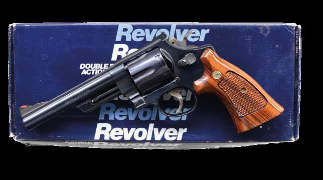 3519. SMITH & WESSON MODEL 57 DOUBLE ACTION REVOLVER WITH CASE. Cal. 41 Mag. S# N606663. Bbl. 5 7/8”. Model 57 double action revolver mfg. by Smith & Wesson circa. 19791980. Left side of the bbl. is marked “SMITH & WESSON”, with the cal. designation marked on the right. Right side of frame is marked with the S&W trademark logo, followed by S&W’s mfg. information. Metal components exhibit a blue finish overall, save for on the trigger and hammer, which exhibit a case color hardened finish. Frame is mounted with 2-piece S&W medallion checkered wood grips. Red ramped front sight, with adj. square notch rear sight. UNATTACHED ACCESSORIES: wood display case containing a takedown tool and cleaning rod. CONDITION: metal components retain the majority of their original factory blue finish, exhibiting some light to mild edge wear, some scattered superficial handling marks, as well as cleaned areas of pitting on either side of the muzzle. Trigger and hammer retain strong case color hardening. Mirror bore, exhibiting well defined rifling throughout. Grips are very good to excellent overall. Case shows some light exterior wear from handling and storage, but otherwise remains sturdy and serviceable. (24-5637/MLW). MODERN. $800-1,200.