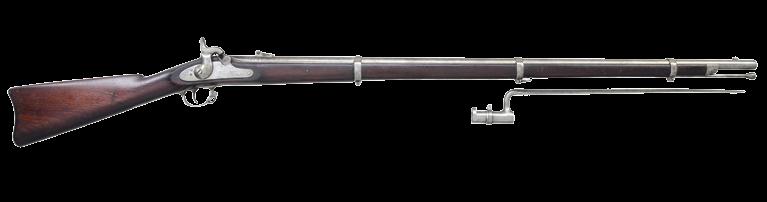 militia units. Bbl. 21”. Blade front sight w/ single leaf rear sight. Action has center mounted hammer with saddle ring & bar on left side. Bbl. swivels to right for loading. Extractor lug is mounted on the right side of bbl. Walnut stock w/ crescent steel buttplate. UNATTACHED