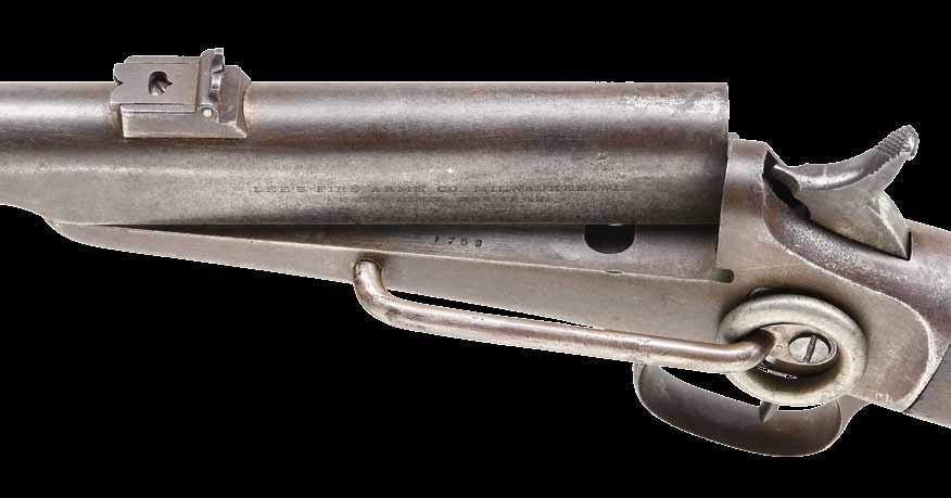 rear sight. Breech lever is lifted up & back for loading. Lever & lockplate have first type “J.H. MERRILL BALTO” markings. Band fastened second type walnut stock w/ brass fittings. Left side has saddle ring & bar w/ 1 clear cartouche. Total quantity mfg. of about 14,495. CONDITION: metal finish has faded to gray showing small handling marks & some light pitting. Stock shows wear w/ scattered dents & marks. Lightly pitted bore retains sound rifling. PROVENANCE: ex-collection of Paul Eseppi. (01-