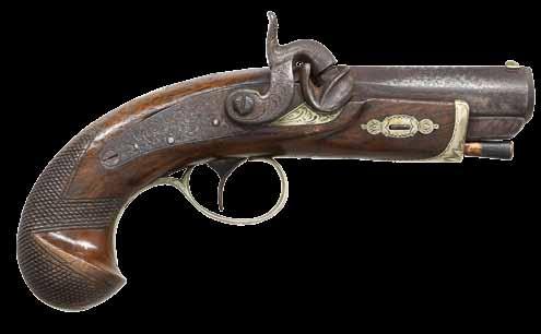 31. NSN. Bbl. 3 7/16” octagon of German silver has Birmingham proofs on left flat. Folding 3” spear point blade on right side with smaller 2” folding blade on lefe. Blades are marked “JAMES RODGERS SHEFFIELD”. Bar style hammer & folding trigger. German silver body has 2 removable tweezers and trap door compartment at rear. Bone scales. Weight 15 ozs. CONDITIION: German silver shows a light tarnish. Left scale is cracked below mid point of bbl. & at toe with a chip at the heel. Lightly pitted bore. PROVENANCE: Marshall “Brook” Davis Collection. (01-23545/DS). ANTIQUE. $1,500-2,500.