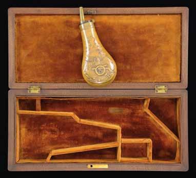 4393. DELIGHTFUL CASED PAIR OF NRA WINNING PHILADELPHIA SMOOTHBORE PERCUSSION DUELING PISTOLS BY KUNZ-ROBERTSON, FORMER WILLIAM R. ORBELO COLLECTION. Cal. 52. NSN. Bbl. 8 1/8”. Delightful pair of smoothbore percussion dueling pistols produced by William Robertson of Philadelphia, PA, during the mid-19th century. Robertson, a well-known Philadelphia gunsmith and maker of dueling pistols, was active from approximately 1829-1861 and had various shop addresses throughout the city, with his final address being listed at 131 Walnut Street in 1859. The pistols are both marked “ROBERTSON” over the top flat of the faceted Damascus bbls. at the breech. Back action lockplates and dolphin-form hammers exhibit finely executed floral-style engraving, which is also present on the bbl. tangs. Trigger guards are engraved with a floral motif and terminate in a pineapple finial. Wood half-stocks feature narrow pointed checkered wrists with flat butts and exhibit rectangular German silver inlays on the rear of the wrists, as well as German silver bbl. wedge escutcheons and nosecaps. Brass-tipped ebony ramrods feed through a single iron thimble on a half-length rib. Dovetailed German silver blade front sights with deep iron V-notch rear sights. UNATTACHED ACCESSORIES: fitted hardwood case featuring a green fabric lining and containing a key, 3 percussion cap tins, 1 ball mold, 1 brass powder flask, 1 oiler, 1 screwdriver, 1 nipple wrench, as well as a cleaning rod. Interior of lid retains an NRA annual meetings exhibit weapons award Certificate of Recognition (Certificate #200) that was awarded at the 190th Annual Meetings of the NRA on April 13th of 1980 at Kansas City, MO, that is marked “Pair of Kunz-Robertson, Philadelphia Dueling Pistols/ Lt. Col. William R. Orbelo”. CONDITION: iron components, including the lockplates, hammers, bolsters, trigger guards, and thimbles, exhibit a pleasing gray patina overall, with traces of original bluing present on the bbl. tangs. Bbls. retain their distinct Damascus twist patterns, while the balance exhibits an aged gray patina, with some areas showing a pleasing brown patina and scattered spots of appropriate agerelated discoloration. Both actions hold cock, half cock, and function appropriately when cycled by hand. Stocks exhibit some scattered marks from handling and storage, with some small impressions present overall. One pistol exhibits a crack stemming from the breech plug / bbl. tang, but otherwise appears to remain sturdy and serviceable. Case exhibits several notable cracks on the lid, with scattered losses to the exterior layer via age-related delamination overall. Brass components exhibit a pleasing mellow brown patina, with the original lid escutcheon being absent. An exceptionally attractive cased pair of both rare and desirable American-made dueling pistols by Kunz-Robertson that were formerly of the collection of Lt. Col. William R. Orbelo. (01-24818/MLW). ANTIQUE. $6,000-9,000.