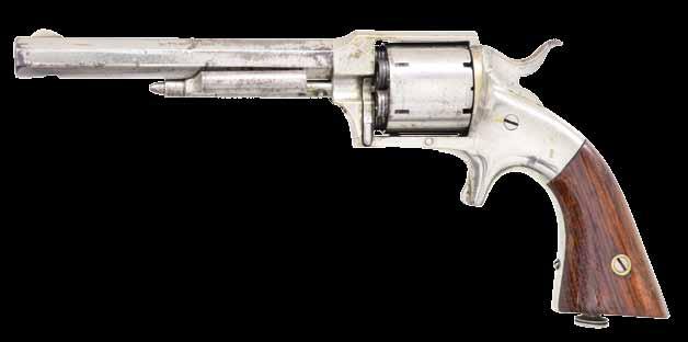 RIFLE. Cal. 50 RF. S# 2991. Bbl. 30” round. Blade front sight w/ graduated leaf rear sight. Bbl. pivots to right for loading through a 7 shot mag. located in the stock. Case colored action marked “MERIDEN MAFG. CO. / MERIDEN, CONN”. Of estimated 5,000 mfg. 1846-45, approx. 3,000 have the 30” bbl. CONDITION: bbl. has over 80% lightly worn blue. Action shows some lightly visible case colors. Stock shows scattered scratches & marks. Bore retains sharp rifling. (01-25928/DS). ANTIQUE. $2,000-3,000.