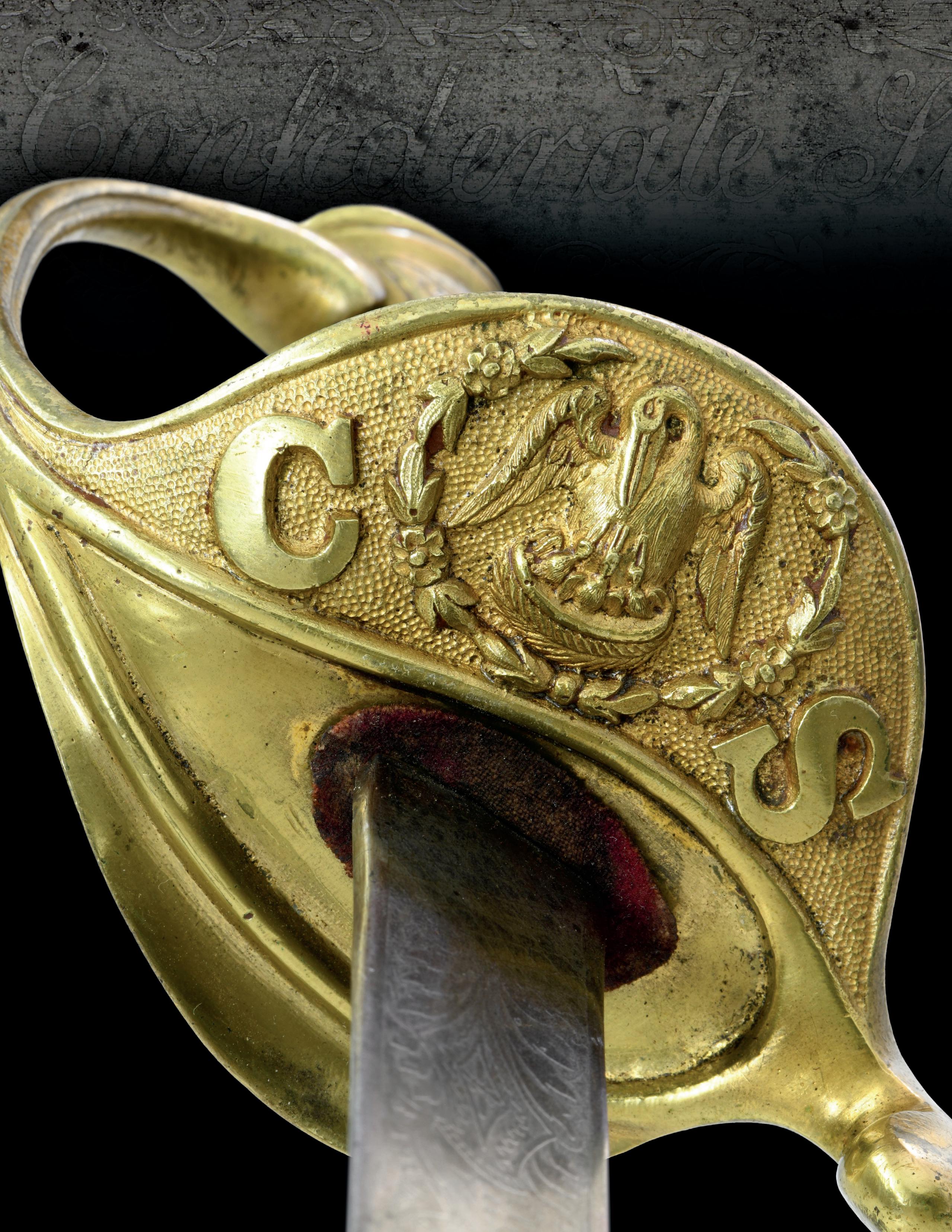4013. IMPORTANT CONFEDERATE PRESENTATION DUFILHO STAFF OFFICER SWORD. Unique high grade Confederate staff officer sword with raised relief “CS” add Louisiana State seal on fine stippled background with etched blade presentation: “by Jefferson Fire Guard to Capt. G. GEYER of the CONFEDERATE STATES of AMERICA March 24, 1862”. The blade is signed by the etcher “ZIMMERMANN” and only known signed example. Sword retains its complete original Dufilho brass mounted leather scabbard, though the blade is broken and missing its last 8” at tip, remaining blade measures 24”. There are several swords with this motif by the best New Orleans Confederate sword manufacturer. This is the more elaborate variant with slightly larger hilt, and most importantly more finely detailed Pelican and wreath and higher relief “CS”. This is a beautiful sword presented just weeks before the fall of New Orleans April 25th 1862 and one of very few with panel etched “CONFEDERATE STATES OF AMERICA”. George Geyer [Geier] was chief engineer in the Carrollton Volunteer Fire Company. He is found in numerous New Orleans newspaper accounts starting in mid-1850s with Fire Company. He is listed in Confederate service as captain of Co. C, Jefferson Fire Guards in 1861-1862 newspaper and archive records. The Jefferson Fire Guards were a Confederate home protection militia that disbanded after Union occupation in April 1862. Carrollton Louisiana was mostly German immigrant neighborhood of New Orleans that was annexed by New Orleans in 1874. Maurice Zimmermann was jeweler & watchmaker in antebellum New Orleans. He is thought to be the Zimmerman who etched & signed blade. He died May 12, 1862, his son Charles carried on the business & was part of Hansa Militia listed as lieutenant. UNATTACHED ACCESSORIES: large file of provenance in binder with several original letters from the 1970s concerning history, including May 31, 1974 letter from pioneer Confederate collector Fred Slaton selling the sword to Dan Hartzler. The sword is featured in two books, and pages are copied in file. National Archive records of George Geyer [Geier] listing in Jefferson Fire Guards and Charles Zimmermann records in Hansa Louisiana Militia of European descent. CONDITION: sword overall is very good. The blade etching is all discernible. Hilt and scabbard mounts are burnished and lacquered like so many displayed brass objects in the Victorian era. The spirally carved wood grip has a couple large chips but retains 80% original worn leather and tight twisted brass wire wrap. Scabbard is complete with top edge seam repair by well-known sword conservator Jim Brown. Sword fits tightly in its original scabbard. (02-19445/JS). NON-GUN. $20,000-30,000.