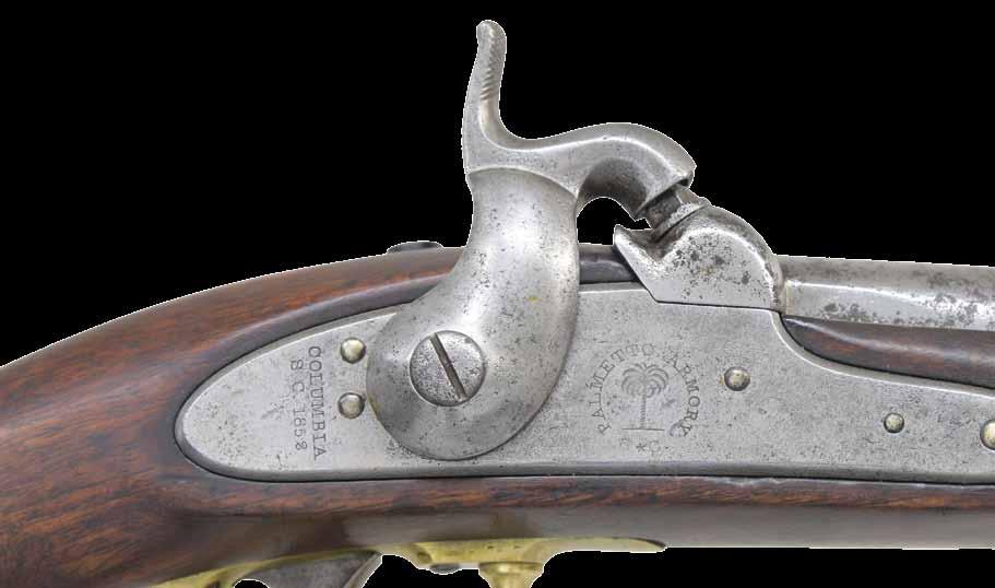 pitting with a series of small dents forward of the front bbl. band. Stock has a heavily worn appearance with dents and marks, having cracks in the wrist area. Lock will not hold in full cock position. Bore is generally bright with surprisingly strong rifling. PROVENANCE: From the Collection of a Tennessee Gentleman. (01-25692/DS). ANTIQUE. $4,000-6,500.