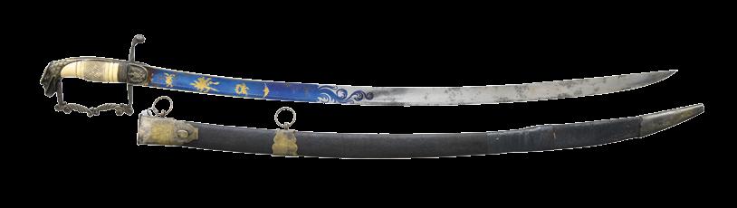 4457. INDIAN ASSOCIATED BRASS SCABBARD SABER. Pictured on page 205 in “THE FUR TRADE” by Author, Milton von Damm: “Indians respected swords and wanted them. Samples of trader orders contain requests for swords for the Indians and a prime source was surplus British swords from the Napoleonic wars. This is one. The handle is wrapped in leather with dangling beads and other Indian decorations.” CONDITION: good to very good. PROVENANCE: Lifelong Collection of author Milton Von Damm. (0222251/JS). $200-300.