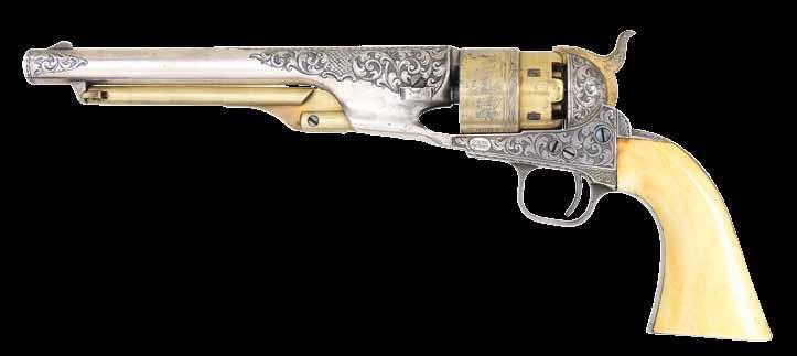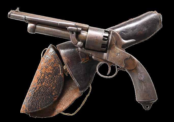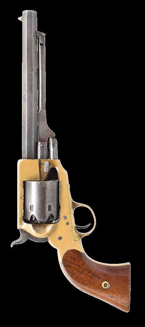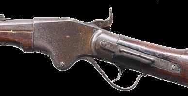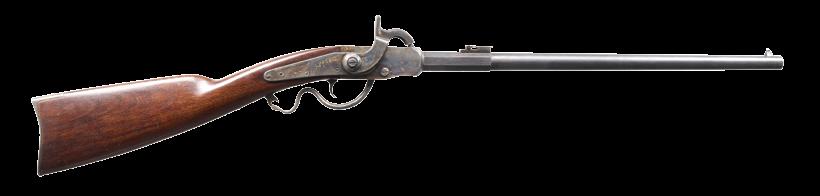 PERCUSSION CARBINE. Cal. 52. S#. 2865X. Successor to the Cosmopolitan, a total of about 8220 mfg. 1863-64. Cavalry units armed w/ these included the: 7th Tennessee, 5th & 8th Ohio, 4th & 8th Missouri, & 3rd Wisconsin. Bbl. 20” round w/ octagon shank. Fixed front w/ graduated leaf rear sight. Lever operated case colored action has saddle ring & bar on left side. Breech block tips down for loading. Walnut stock w/ steel carbine buttplate has a clear cartouche on left side. CONDITION: fine, over 90% lightly faded blue & case colored finish. Good original stock finish shows scattered handling. marks. Bright bore has strong rifling. PROVENANCE: ex-collection of Paul Eseppi. (01-25915/DS). ANTIQUE. $2000-2900.