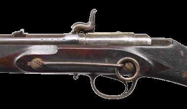 21” carbine style. Rarely seen carbine mfg. by Charles Reeves, Birmingham, ca. 1860. Blade front w/ 1 standing & 2 folding leaf rear sight. Turn bolt breech loading action w/ sliding safety on right side. Island lock is marked “C. Reeves / Patent”. Full length walnut carbine stock is held by 2 bands w/ checkering at wrist & forend. Iron nose cap & buttplate w/ slotted tip iron ramrod. CONDITION: Bbl. has lightly faded browned finish. Lock & receiver retain small amounts of case colors. Stock has age darkened finish w/ sharp checkering showing scattered scratches & marks. Buttplate is missing trap door cover. Sound lock & action. Bore is generally bright showing spots of very light pitting. (01-25783/ DS). ANTIQUE. $1500-2500.