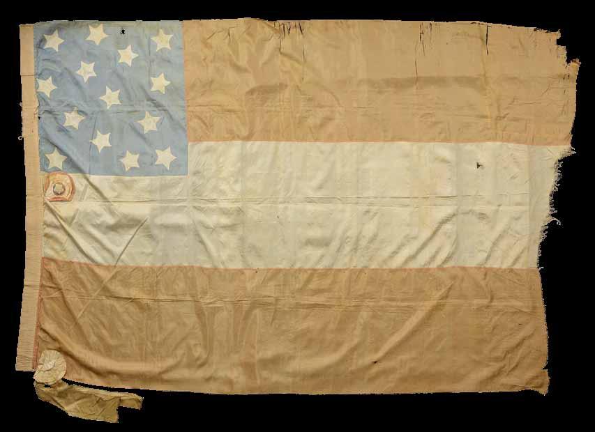 Russell B. Caples: paper files included with this lot include a statement by Russell B. Caples stating “APRIL of 1865 a tough remnant of our old regiment fought under General Kirby Smith….Returning home to Glasgow, I kept my sash and the flag under which I had fought so many battles. Mother had died and father [Confederate chaplain] was mortally wounded by a cannon shell during the battle of Glasgow [October 15, 1864]. I arrived home with no job and two half sisters to support.” Russell Bigelow Caples (1841-1915) entered service as private in Searcy Sharpshooters in 1862 was promoted to Lieutenant serving till June 7, 1865 when he was given his parole of honor at Shreveport, Louisiana. The Searcy Sharpshooter’s served in western theatre under Generals Earl Van Dorn & Sterling Price. Upon his return home finding such devastation, he turned to law, becoming an attorney and later a well-respected judge till his death in 1915. He retained this wonderful early war manufactured flag, characteristic of Missouri having unusual arranged canton of 14 stars. Flag is constructed of light weight silk and in remarkable condition considering its age and use. Flag is classic “stars & bars” or Confederate 1st National all hand sewn with 2 attached patriotic rosettes also of silk. Flag measures 41” hoist, 2” cotton sleeve, 62” on fly, canton is 19” x 17.5” with double applique 3” silk stars. UNATTACHED ASSESSORIES: research letter by Confederate flag authority Greg Biggs & file of research on RB Caples and his regiment. CONDITION: very good overall, flag is solid and easily handled though fragile, fraying & splitting of silk in both red bars, losses at fly end from use, still 98% complete, red bars faded to red/brown. 3 small holes the size of minié balls are found in canton, top red bar, and white bar. (02-21024-1/JS). $30,000-40,000.